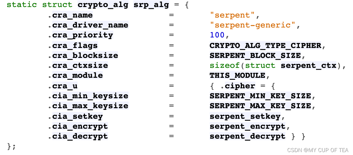 - 加密框架支持Serpent算法,记为serpent,其实现源码为serpent.c。