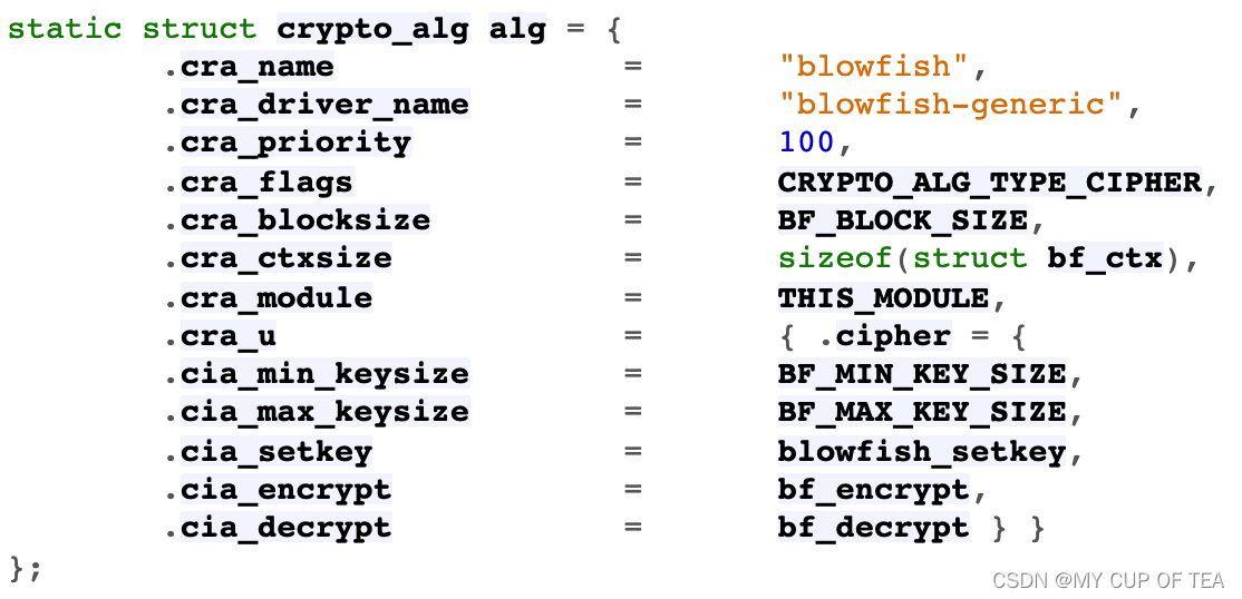 - 加密框架支持Blowfish算法,记为blowfish,实现源码为blowfish_generic.c和blowfish_common.c。