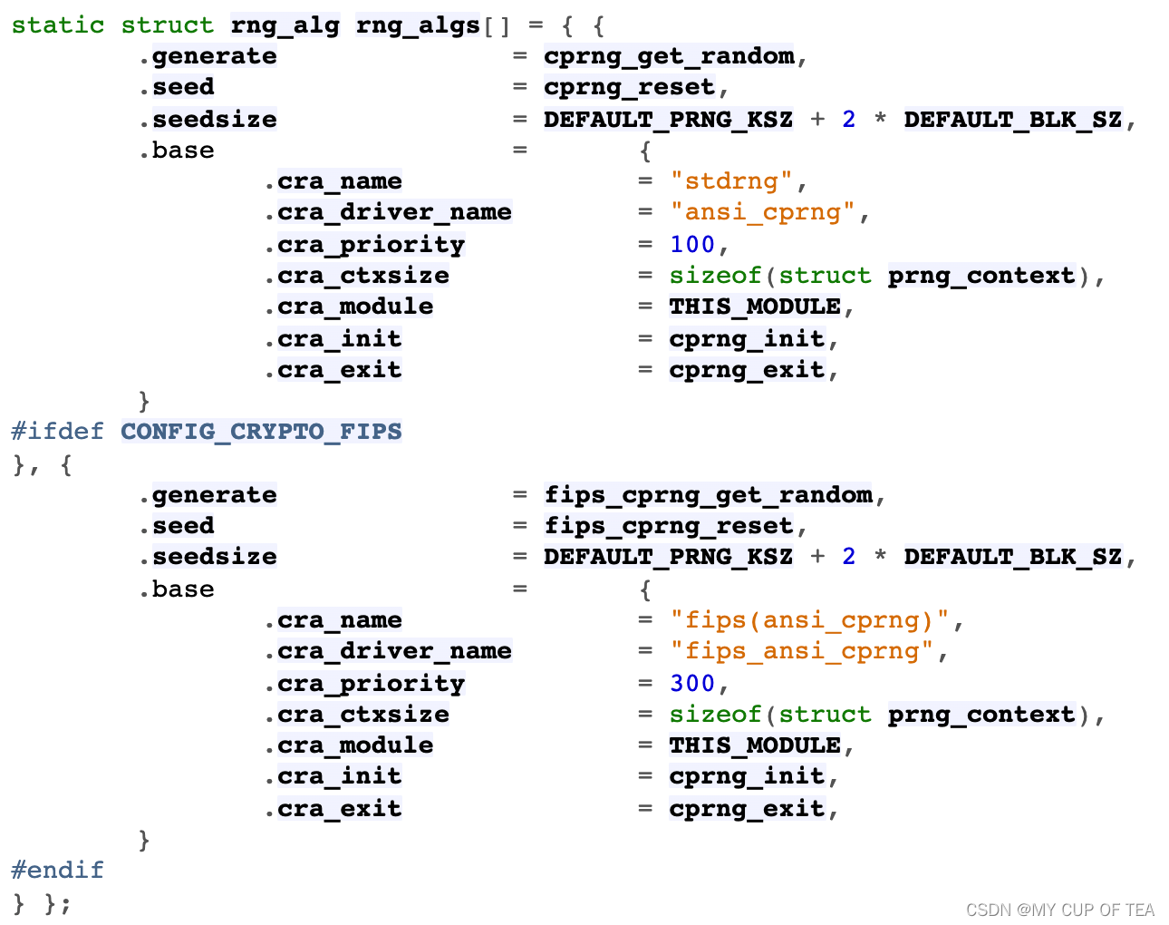 - 注:在ansi_cprng.c中,还定义了一种符合FIPS(Federal Information Processing Standard,即联邦信息处理标准)的伪随机数生成算法,记为fips(ansi_cprng),但必须在宏开关CONFIG_CRYPTO__FIPS开启时才有效。