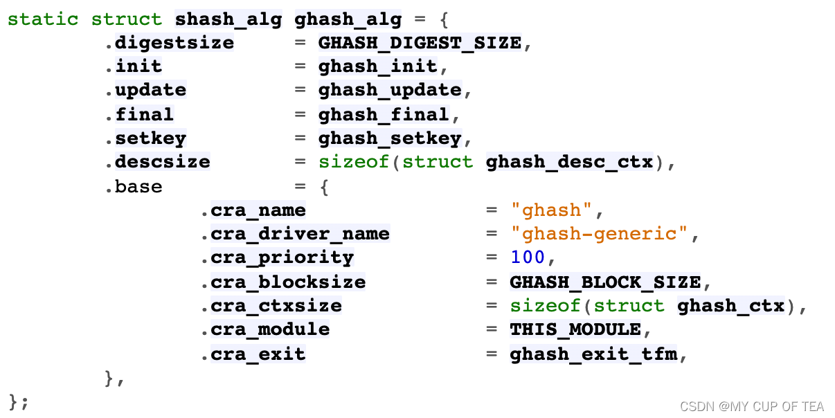 - 在加密框架中,将定义在伽罗华(Galois)域(仅含有限多个元素的域)的泛散hash函数定义为独立的算法,记为ghash,其实现源码为ghash_generic.c。