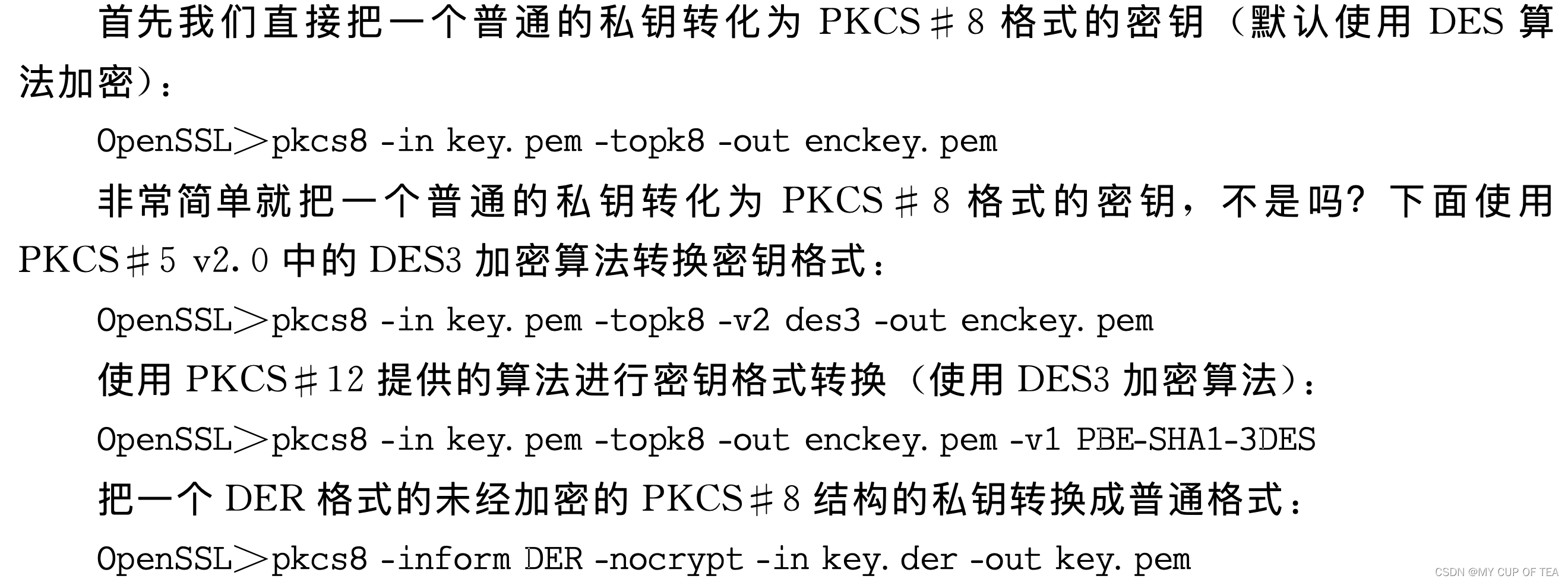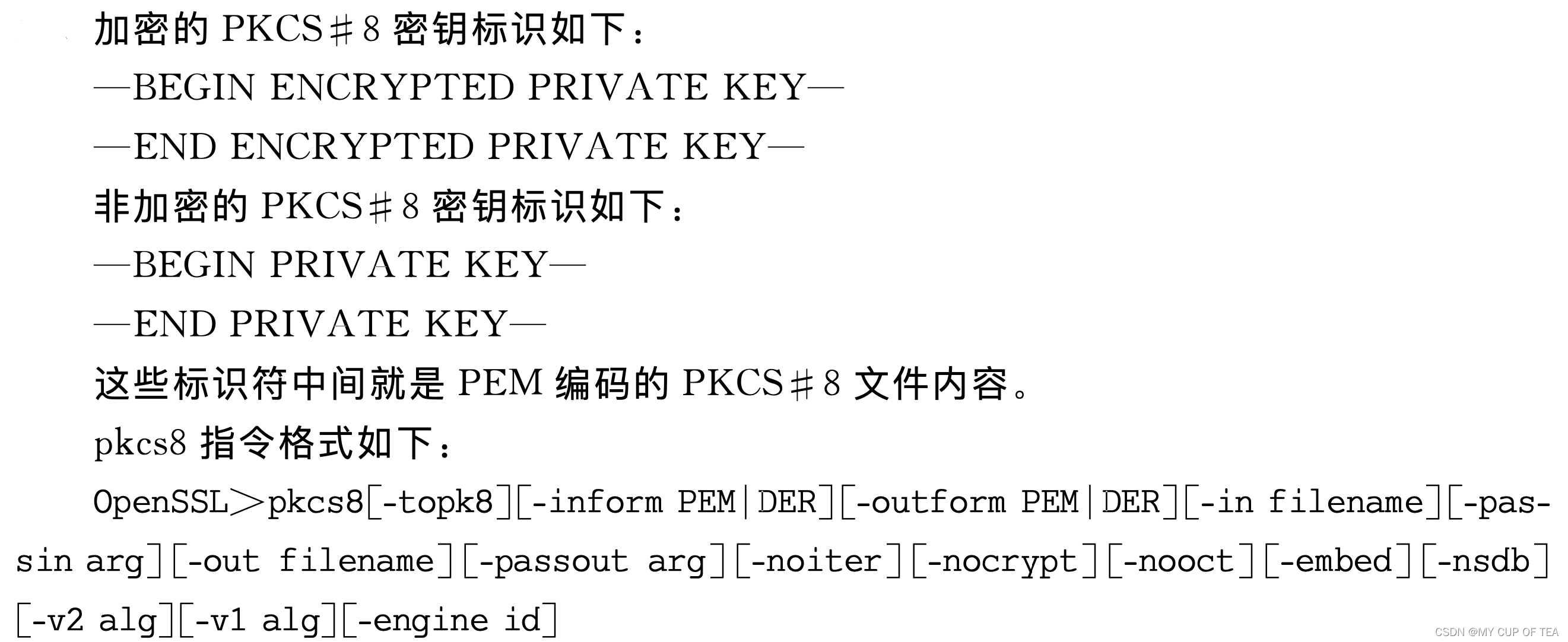 - 使用pkcs8指令时,通常情况下输入或是产生的PKCS#8格式的密钥都是使用口令基于某种算法加密的私钥信息结构。