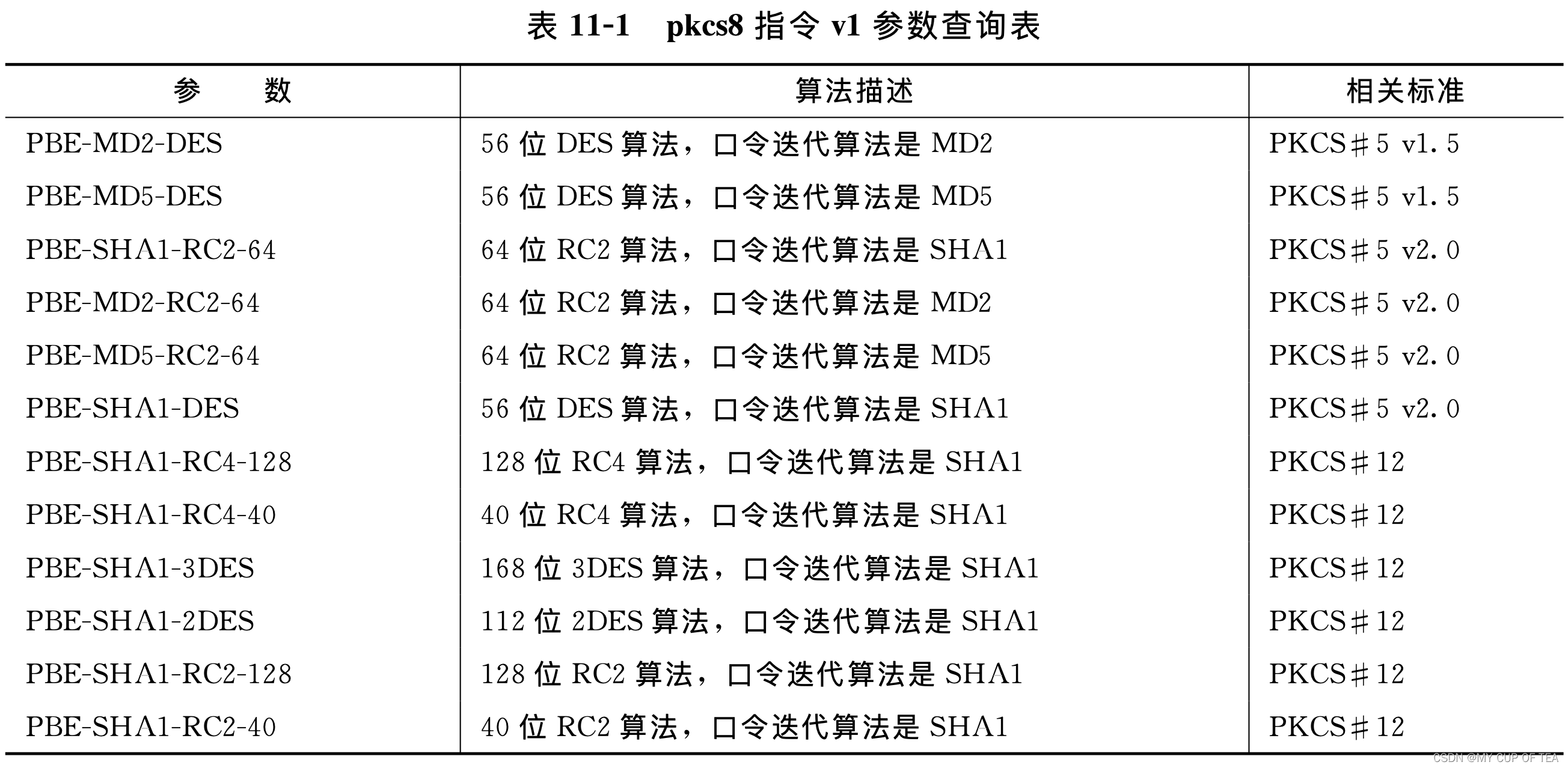 - v1选项用于选择PKCS#5v20中的所有算法。一般情况下,PKCS#8结构的私钥是使用pbeWithMD5AndDES-CBC这种口令加密算法加密的。虽然这种算法只使用了56bit的DES加密,但已经是PKCS#5v1.5中加密强度最高的算法。