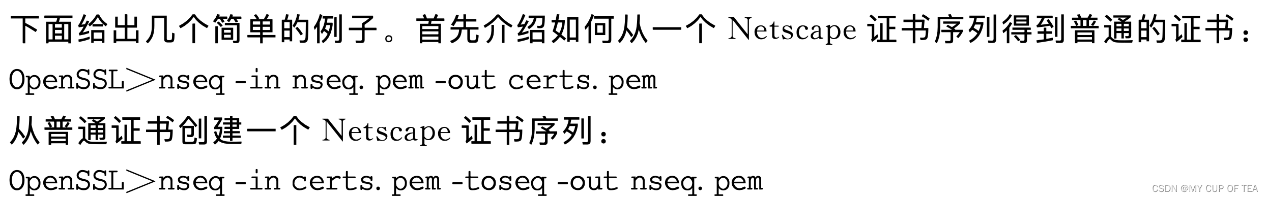 - nseq指令的任务简单而明确:将普通X.509证书封装成Netscape证书序列,或者将Netscape证书序列转换成普通的X.509证书。