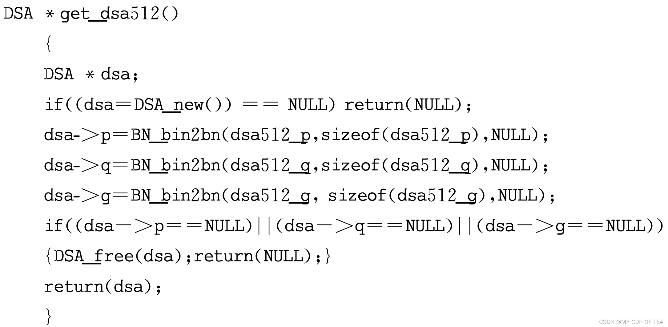 - 首先是dsaparam指令,该指令主要用来生成DSA密钥参数,并提供了一些格式转换、C代码生成等其他类似于dhparam指令的功能。一组DSA参数可以用来生成多个不同的DSA密钥,而不是仅仅对应于一个DSA密钥。
