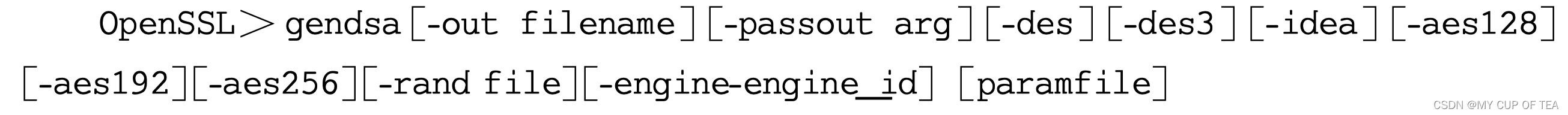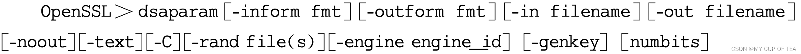 -  dsaparam 用于生成和管理DSA密钥参数,其功能和参数类似dhparam,使用dsaparam 生成的密钥参数不仅仅可以用于生成不同的DSA密钥,还可以用于生成DH密钥参数