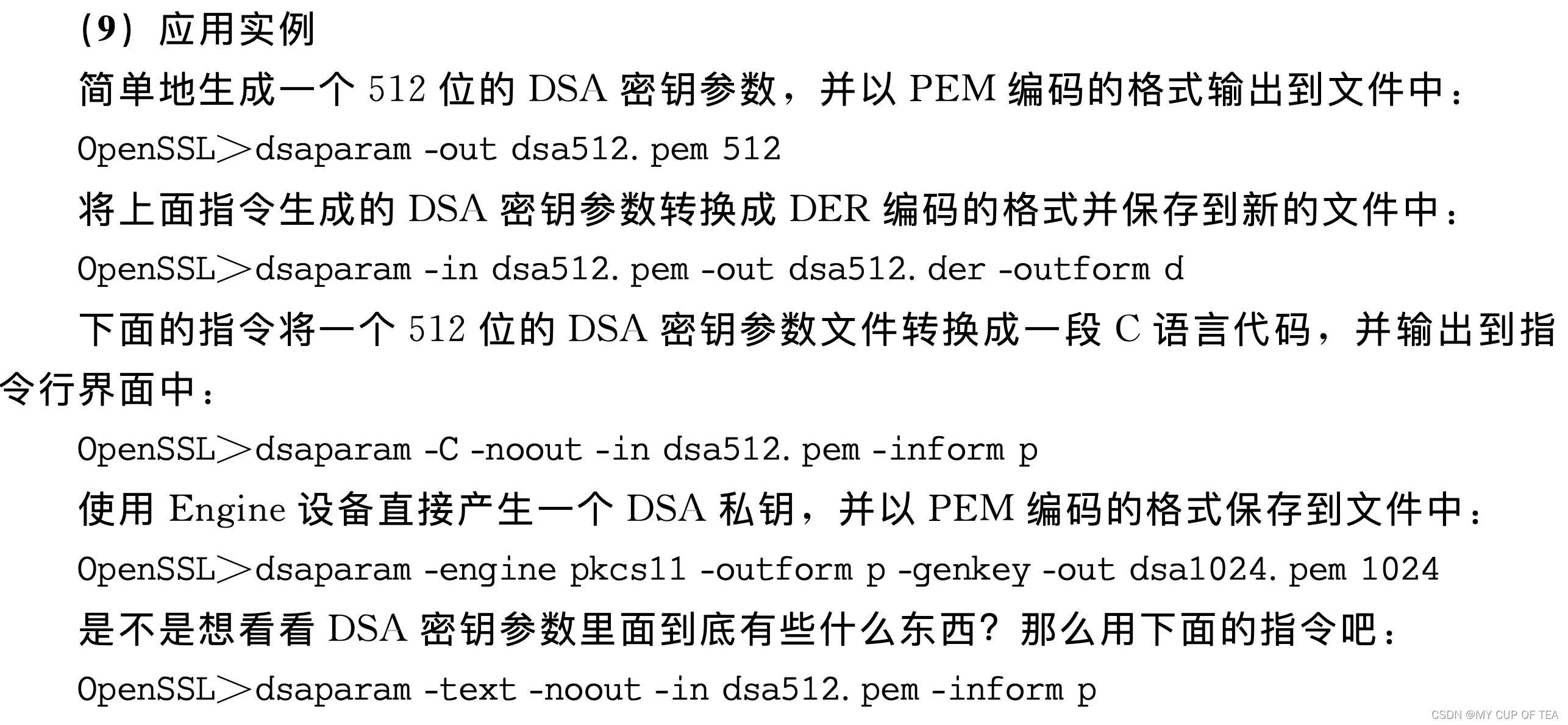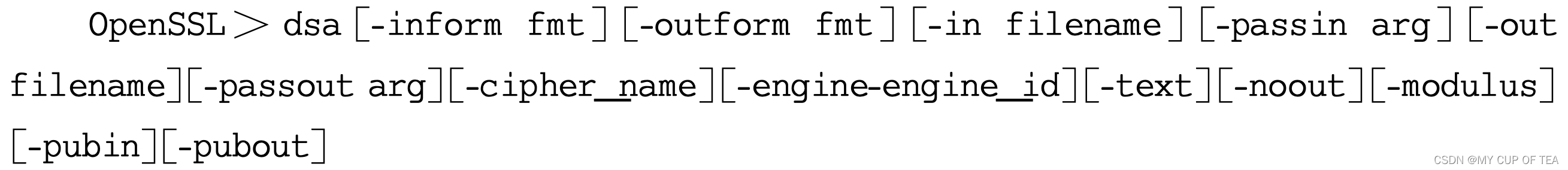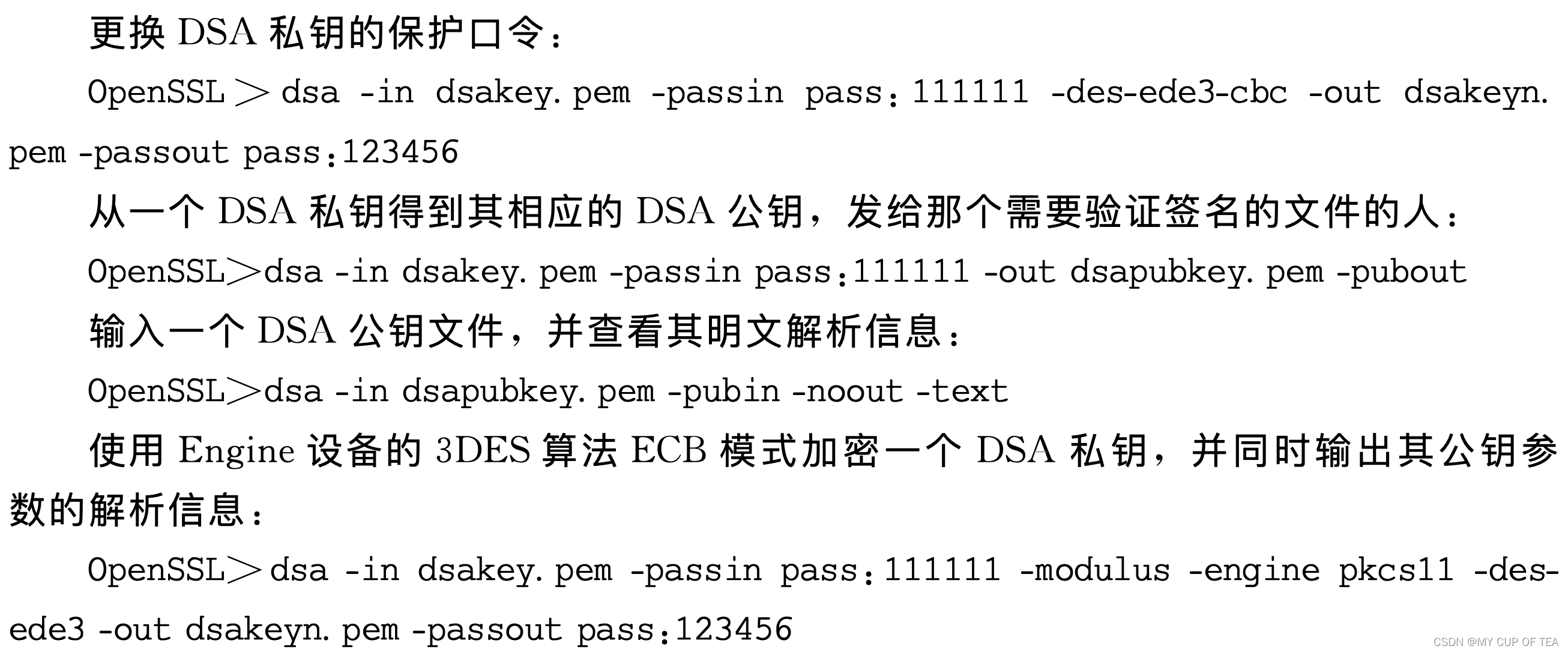 - 同样,为了提供一些可能需要的DSA密钥管理功能,如格式转换、保护口令更改等,OpenSSL提供了dsa指令