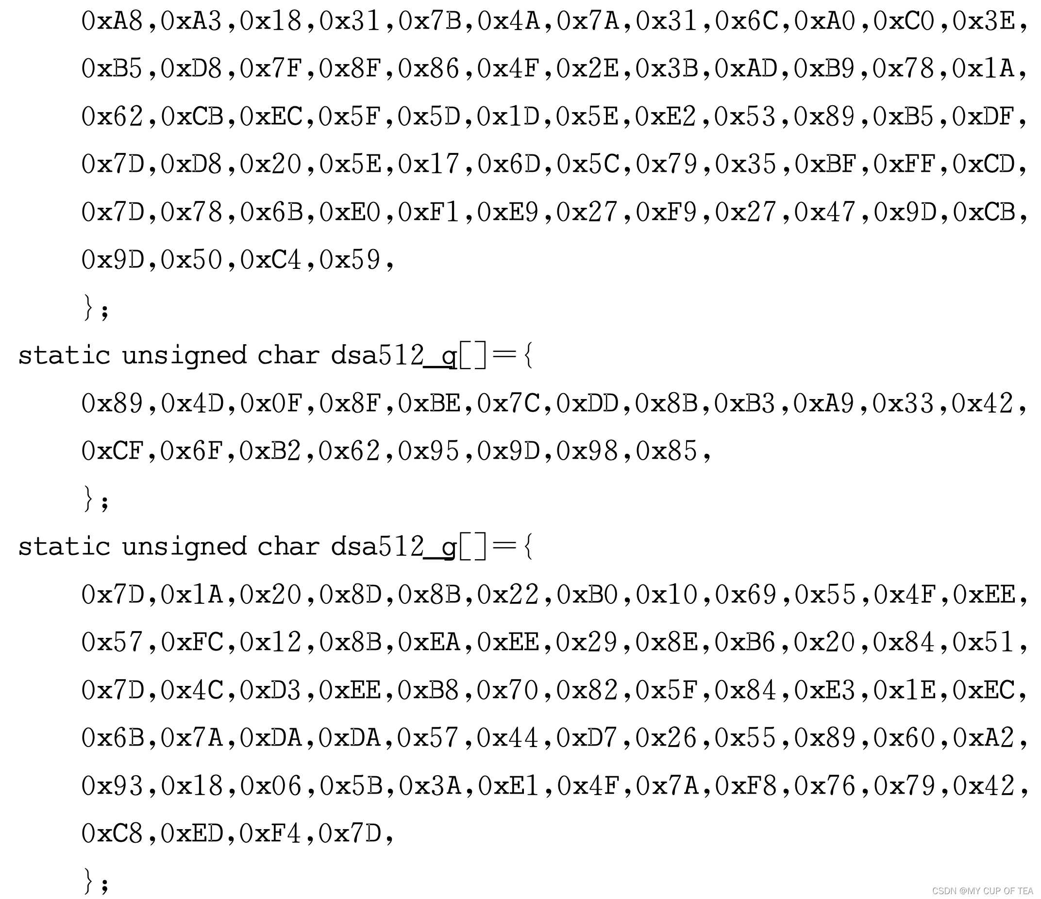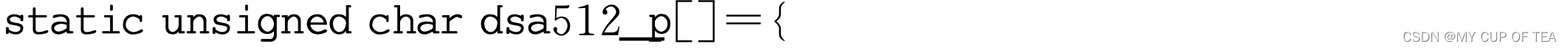 - (5)C语言代码输出选项某些时候,我们可能需要将DSA密钥参数写入到C语言的代码中去,OpenSSL提供了从一组DSA密钥参数转换成代码的方法,就是在dsaparam指令中使用C选项。下面是使用dsaparam指令的C选项生成的一段DSA密钥参数的C语言代码。