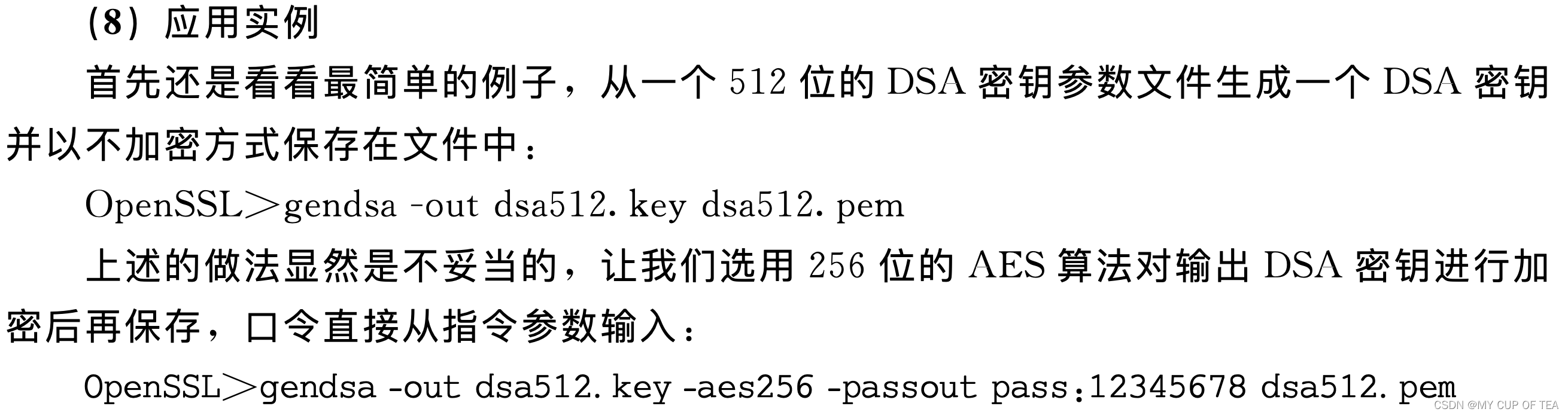 - (6)加密算法选项dsa指令提供了更加丰富的密钥加密算法,理论上,所有OpenSSL支持的对称加密算法都可以在这里用于加密DSA私钥。使用的方式是直接输入该对称加密算法的合法名称。