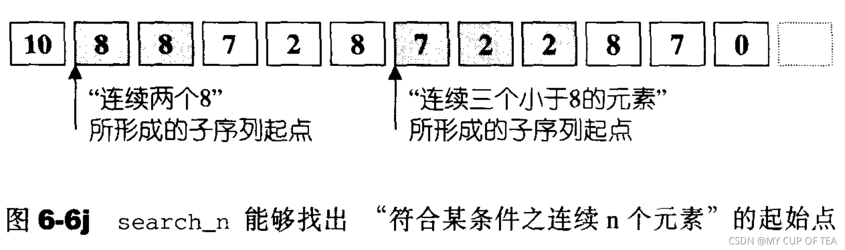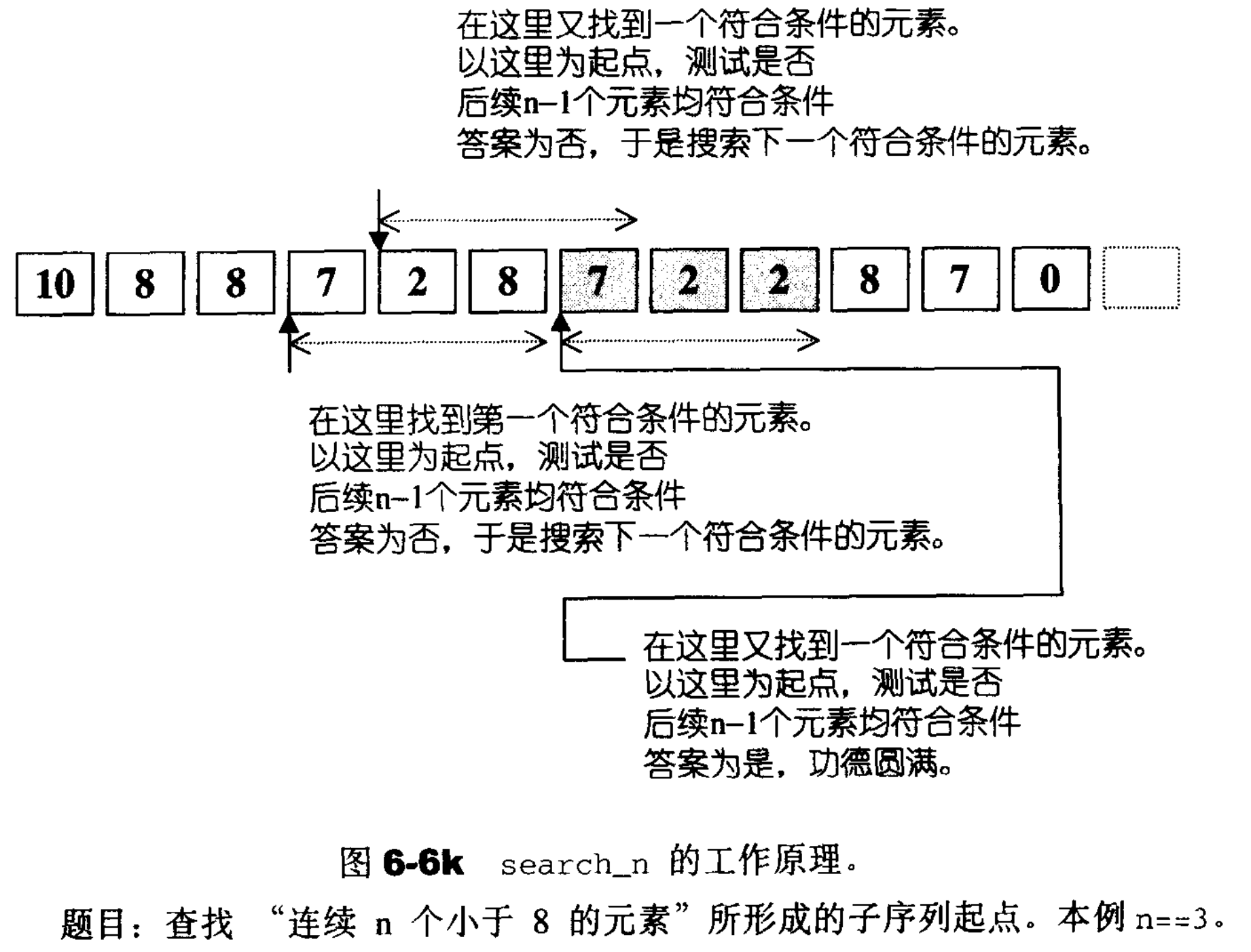 }int main () {int myints[]={10,20,30,30,20,10,10,20};std::vector<int> myvector (myints,myints+8);std::vector<int>::iterator it;// using default comparison:it = std::search_n (myvector.begin(), myvector.end(), 2, 30);if (it!=myvector.end())std::cout << "two 30s found at position " << (it-myvector.begin()) << '\n';elsestd::cout << "match not found\n";// using predicate comparison:it = std::search_n (myvector.begin(), myvector.end(), 2, 10, mypredicate);if (it!=myvector.end())std::cout << "two 10s found at position " << int(it-myvector.begin()) << '\n';elsestd::cout << "match not found\n";return 0;
