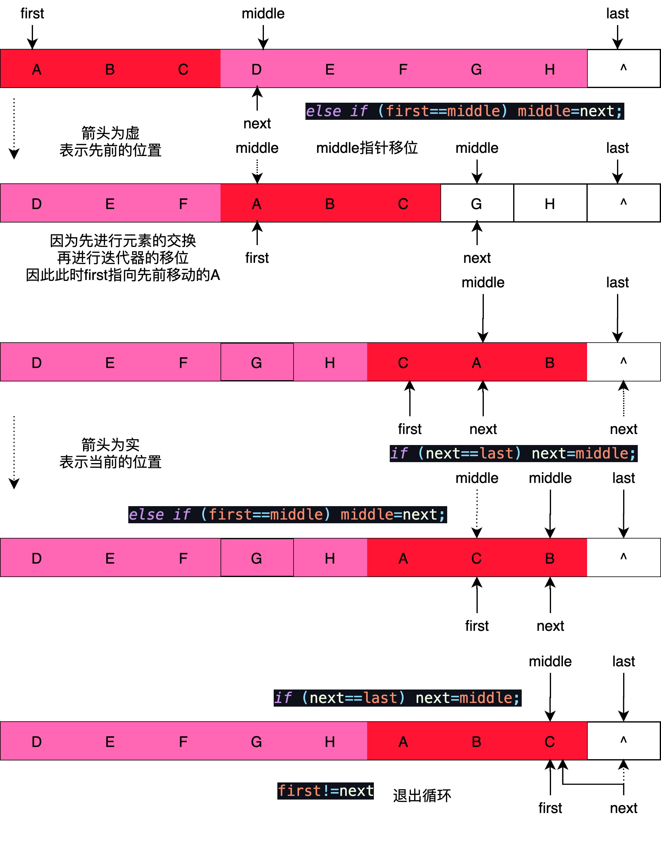 {ForwardIterator next = middle;while (first!=next){swap (*first++,*next++);if (next==last) next=middle;else if (first==middle) middle=next;}
