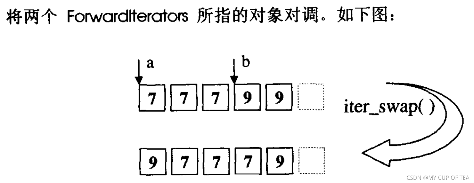 template <class ForwardIterator1, class ForwardIterator2>void iter_swap (ForwardIterator1 a, ForwardIterator2 b)