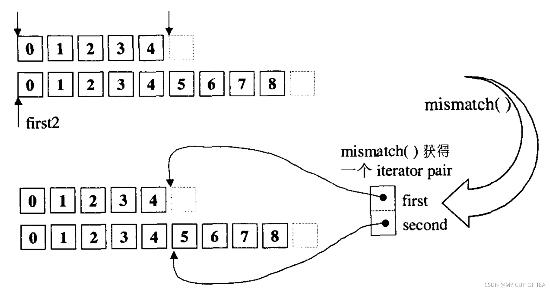- 判断两个区间的第一个不匹配的点,返回一个由两个迭代器组成的pair;pair的第一个迭代器指向的是第一区间第一个不匹配的点,第二个迭代器指向第二个区间的不匹配的点