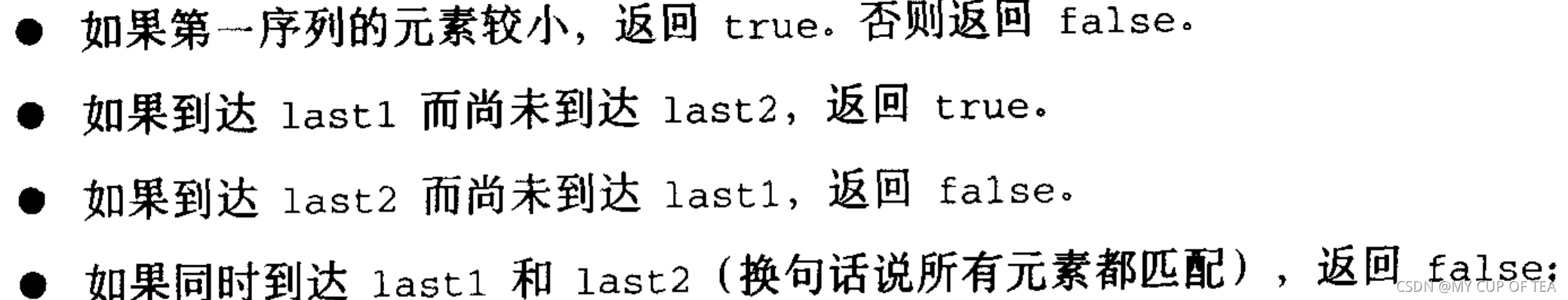- 操作指针比较[first1 , last1) 和 [first2 , last2)对应位置上的元素大小的比较,持续到(1)某一组元素数据不相等;(2)二者完全相等,同时到达两个队列的末尾(3)到达last1或者last2