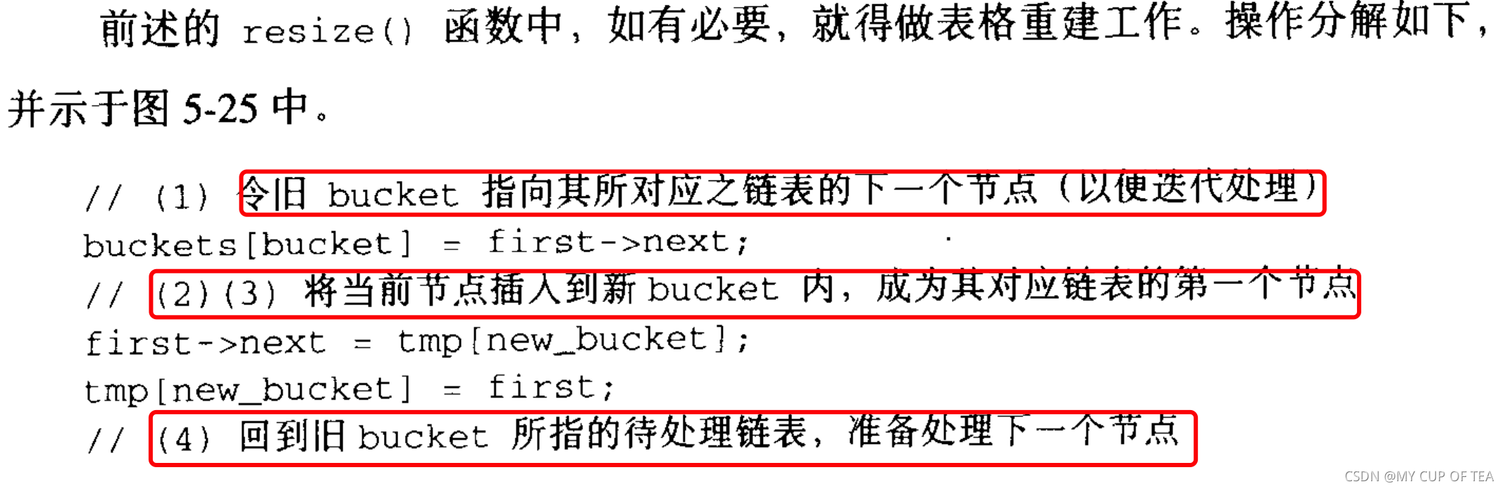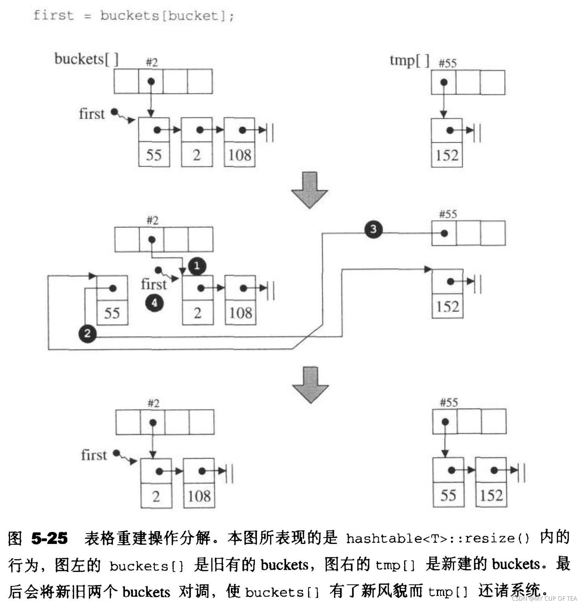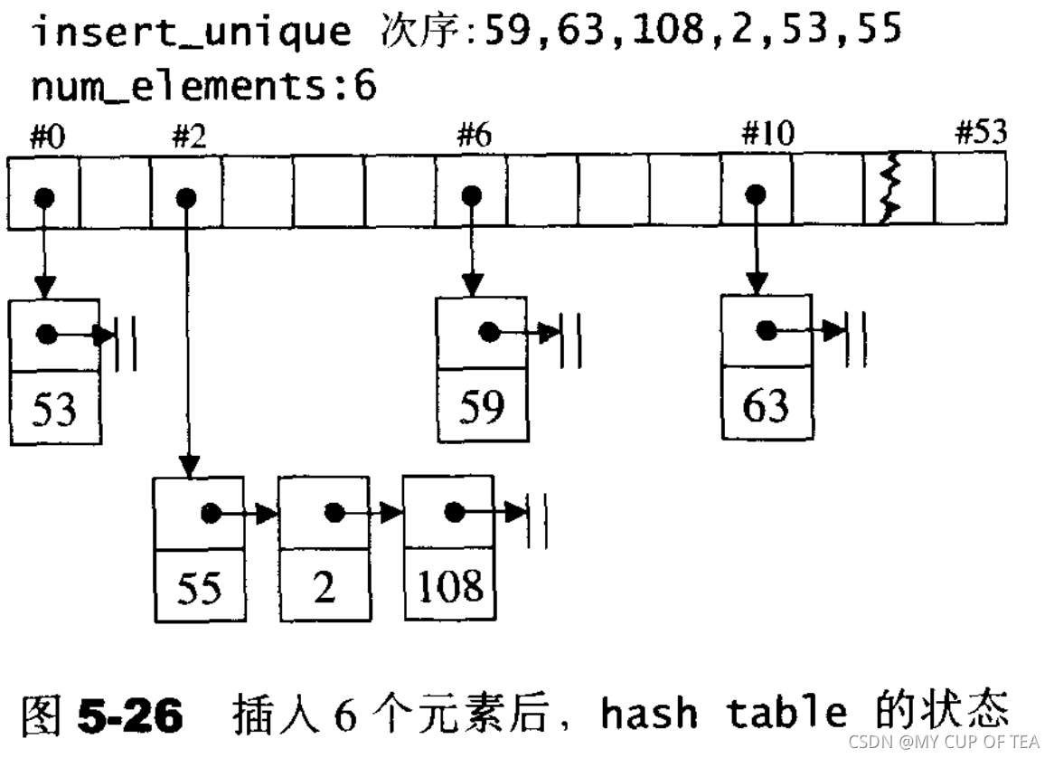 public://bucket个数 即buckets vector的大小size_type bucket_count() const{return buckets.size();}//注意假设 假设long至少有32bitstatic const int __stl_num_primes = 28;constexpr static const unsigned long __stl_prime_list[__stl_num_primes] ={53, 97, 193, 389, 769,1543, 3079, 6151, 12289, 24593,49157, 98317, 196613, 393241, 786433,1572869, 3145739, 6291469, 12582917, 25165843,50331653, 100663319, 201326611, 402653189, 805306457,1610612741, 3221225473, 4294967291};//找出上述28指数中,最接近并大于n的那个质数inline unsigned long __stl_next_prime(unsigned long n){const unsigned long *first = __stl_prime_list;const unsigned long *last = __stl_prime_list + __stl_num_primes;const unsigned long *pos = std::lower_bound(first,last,n);//使用lower_bound() 需要先进行排序return pos == last ? *(last-1) : *pos;}//总共有多少个buckets。以下是hash_table的一个member functionsize_type max_bucket_count()const{//其数值将为 4294967291return __stl_prime_list[__stl_num_primes - 1];}//构造函数hashtable(size_type n,const HashFcn& hf,const EqualKey& eql):hash(hf),equals(eql),get_key(ExtractKey()),num_elements(0){initialize_buckets(n);}//初始化函数void initialize_buckets(size_type n){//例子:传入50 返回53//然后保留53个元素的空间 然后将其全部填充为0const size_type n_buckets = next_size(n);buckets.reserve(n_buckets);//设定所有的buckets的初值为0(node*)buckets.insert(buckets.begin(),n_buckets,(node*)0);}public://版本1:接受实值(value)和buckets个数size_type bkt_num(const value_type& obj, size_t n) const{return bkt_num_key(get_key(obj), n); //调用版本4}//版本2:只接受实值(value)size_type bkt_num(const value_type& obj) const{return bkt_num_key(get_key(obj)); //调用版本3}//版本3,只接受键值size_type bkt_num_key(const key_type& key) const{return bkt_num_key(key, buckets.size()); //调用版本4}//版本4:接受键值和buckets个数size_type bkt_num_key(const key_type& key, size_t n) const{return hash(key) % n; //SGI的所有内建的hash(),在后面的hash functions中介绍}public://相关对应的函数//next_size()返回最接近n并大于n的质数size_type next_size(size_type n) const {return __stl_next_prime(n);}typedef hashtable<Value,Key,HashFcn,ExtractKey,EqualKey,Alloc>iterator;//插入操作和表格重整//插入元素不允许重复std::pair<iterator,bool>insert_unique(const value_type& obj){//判断是否需要重建表格 如果需要就进行扩充resize(num_elements + 1);return insert_unique_noresize(obj);}//函数判断是否需要重建表格 如果不需要立刻返回,如果需要 就重建表格void resize(size_type num_elements_hint){//表格重建与否的原则是:元素的个数(新增元素计入之后)和先前分配的bucket vector进行比较//如果前者的大于后者 就需要表格的重建//因此 bucket(list)的最大容量和buckets vector的大小相同const size_type old_n = buckets.size();if (old_n < num_elements_hint){//需要重新分配内存//计算下一个质数const size_type n = next_size(num_elements_hint);if (n > old_n){std::vector<node*,Alloc>tmp(n,(node*)0);__STL_TRY{//处理每一个旧的bucketfor (size_type bucket=0;bucket<old_n;bucket++) {//指向节点所对应的的串行的起始节点node* first = buckets[bucket];//处理每一个旧的bucket所含(串行)的每一个节点while(first){//串行节点还未结束//找出节点落在哪一个新的bucket内部size_type new_bucket = bkt_num(first->val,n);//以下四个操作颇为巧妙//(1)令旧bucket指向其所对应的串行的下一个节点(以便迭代处理)buckets[bucket] = first->next;//(2)(3)将当前节点插入到新的bucket内部,成为其对应串行的第一个节点first->next = tmp[new_bucket];tmp[new_bucket] = first;//(4)回到旧的bucket所指向的待处理的串行,准备处理下一个节点first = buckets[bucket];}}//对调新旧两个buckets//离开的时候会释放tmp的内存buckets.swap(tmp);};}}}//在不需要重建表格的情况下插入新的节点 键值不允许重复std::pair<iterator,bool>insert_unique_noresize(const value_type& obj){const size_type n = bkt_num(obj) ;//决定obj应该位于 第n n bucketnode* first = buckets[n]; //令first指向bucket对应的串行头部//如果Buckets[n]已经被占用 此时first不再是0 于是进入以下循环//走过bucket所对应的整个链表for (node* cur = first;cur;cur = cur->next) {if (equals(get_key(cur->val)),get_key(obj)){//如果发现和链表中的某个键值是相同的 就不插入 立刻返回return std::pair<iterator,bool>(iterator(cur, this), false);}//离开上述循环(或者根本没有进入循环的时候)first指向bucket的所指链表的头部节点node* tmp = new_node(obj); //产生新的节点tmp->next = first;buckets[n] = tmp; //令新的节点成为链表的第一个节点++num_elements; //节点的个数累加return std::pair<iterator,bool>(iterator(tmp,this),true);}}//客户端执行的是另外一种节点的插入行为(不再是insert_unique 而是insert_equal)//插入元素 允许重复iterator insert_equal(const value_type& obj){//判断是否需要重建表格 如果需要就进行扩充resize(num_elements+1);return insert_equal_noresize(obj);}//在不需要重建表格的情况下 插入新的节点,键值是允许重复的iterator insert_equal_noresize(const value_type& obj){const size_type n = bkt_num(obj); //决定obj应该位于第 n bucketnode* first = buckets[n];//令first指向的bucket对应的链表的头部//如果bucket[n]已经被占用,此时的first不为0,进入循环//遍历整个链表for(node* cur = first;cur;cur = cur->next){if (equals(get_key(cur->val),get_key(obj))){//如果发现与链表中的某个键值相同,就马上插入,然后返回node* tmp = new_node(obj); //产生新的节点tmp->next = cur->next;//新节点插入目前的位置cur->next = tmp;++num_elements;return iterator (tmp, this); //返回一个迭代器 指向新增的节点}//进行