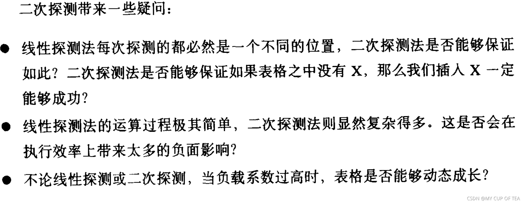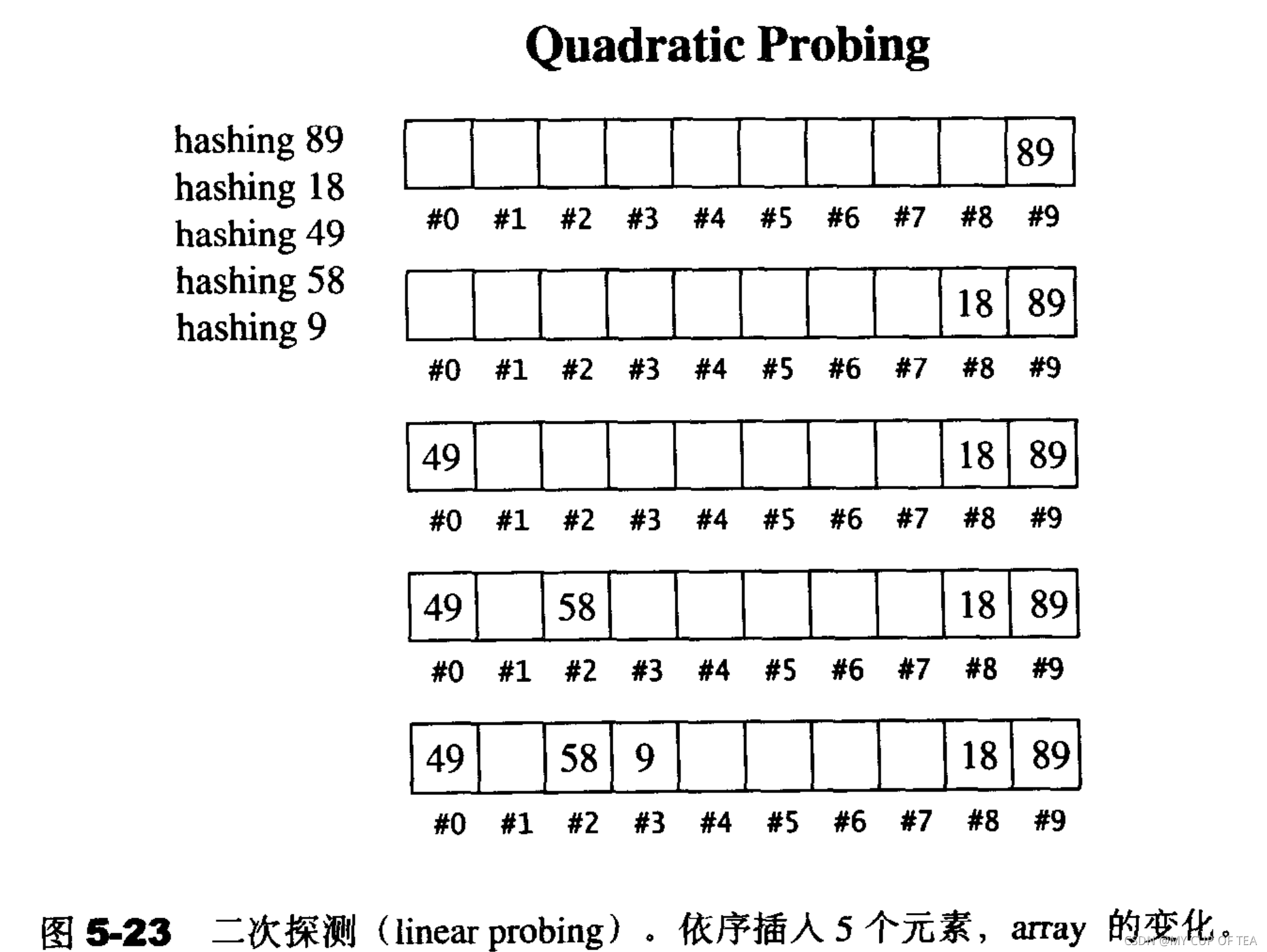 - F(i) = i^2,如果计算得到新元素的位置是H,但是这个位置已经被占用了,将会依序尝试 H+1^2 H+2^2 H+3^2 等等,而不是H+1 H+2