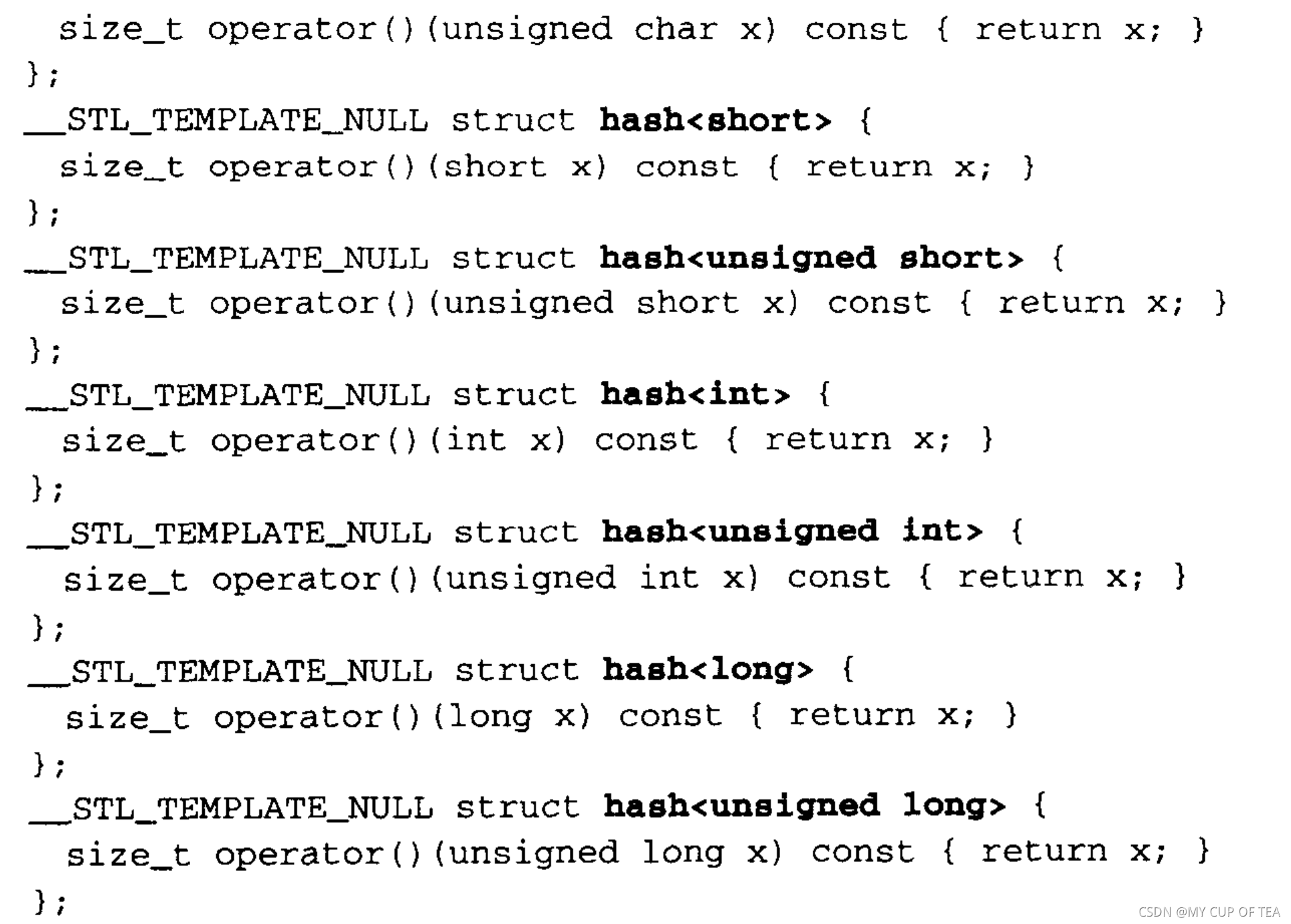 }template <class Key> struct hash{};inline size_t __stl_hash_string(const char* s){unsigned long h = 0;for(;*s;++s){h = 5*h + *s;}return std::size_t (h);