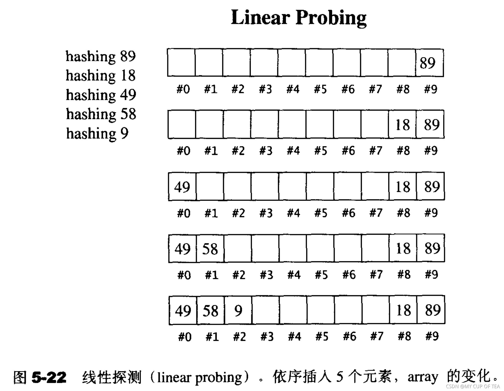 - 使用线性探测时,根据散列函数计算得到的位置已经存在了元素,就需要循环往下一一寻找,如果到达array的尾端,就需要绕回到头部继续寻找,直到找到一个可用的空间为止。