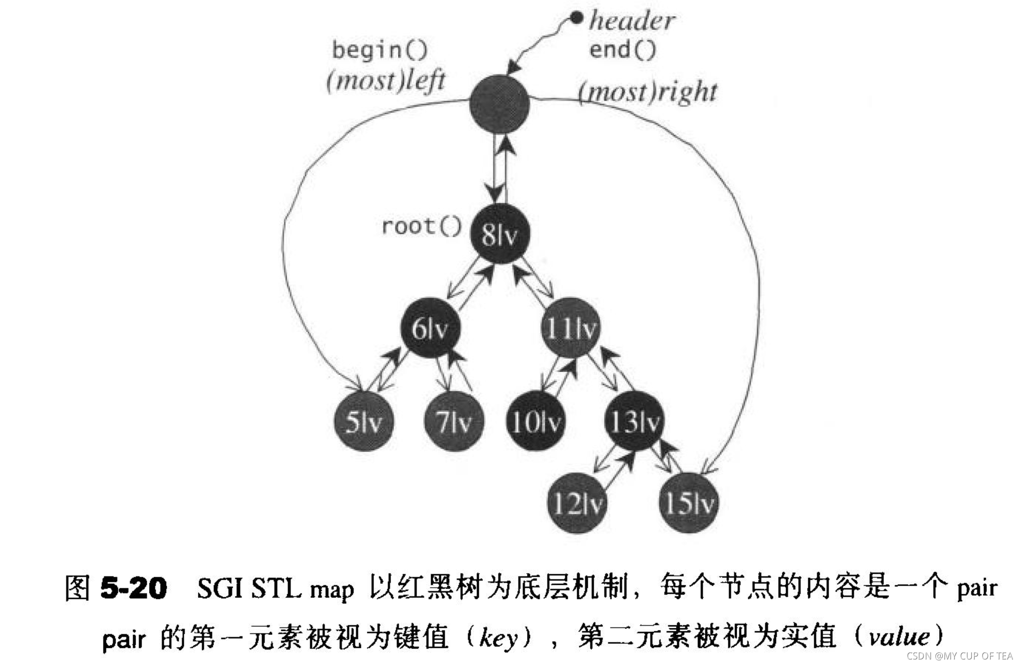 protected://RB-tree只使用三笔数据表现size_type node_count; //追踪记录树的大小 (节点的数量)link_type header; //实现上的小技巧Compare key_compare; //节点之间的键值大小的比较准则. 应该会是一个function object//以下三个函数用于方便获取header的成员link_type& root() const{return (link_type&)header->parent;}link_type& left_most() const{return (link_type&)header->left;}link_type& right_most() const{return (link_type&)header->right;}//以下六个函数用于方便获得节点x的成员static link_type& left(link_type x){ return(link_type&)x->left;}static link_type& right(link_type x){ return(link_type&)x->right;}static link_type& parent(link_type x){ return(link_type&)x->parent;}static reference value(link_type x){ return x->value_field;}static const Key& key(link_type x){ return KeyOfValue()(value(x));}static color_type& color(link_type x){return (color_type&) (x->color);}//获取极大值和极小值 node class有实现此功能static link_type minimum(link_type x){return (link_type) __rb_tree_node_base::minimum(x);}static link_type maximum(link_type x){return (link_type) __rb_tree_node_base::maximum(x);}//迭代器typedef __rb_tree_iterator<value_type,reference,pointer>iterator;