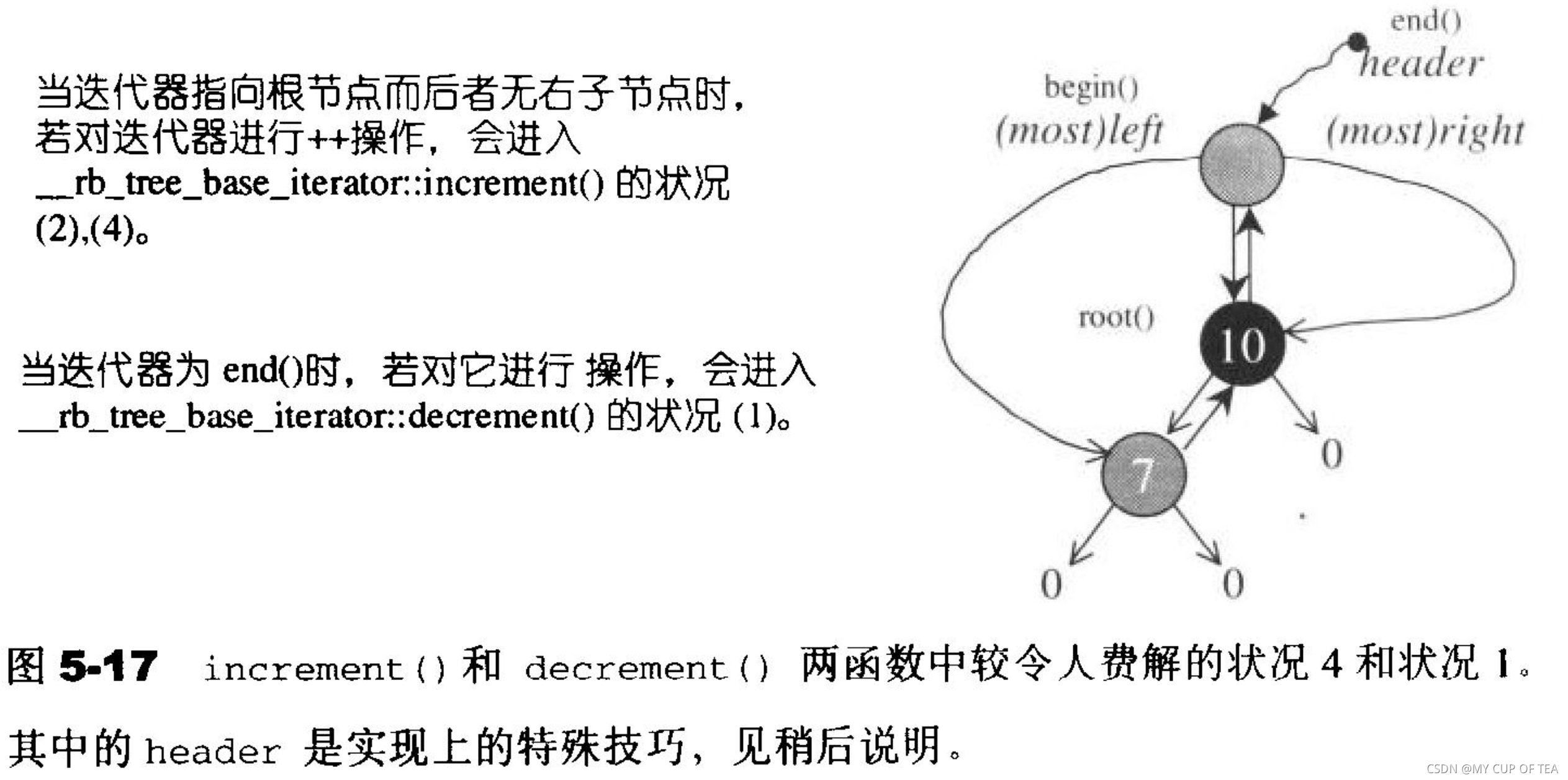 - RB-Tree迭代器前进操作operator++ 调用了基层的increment;RB-Tree迭代器的后退操作operator--调用了基层的decrement;