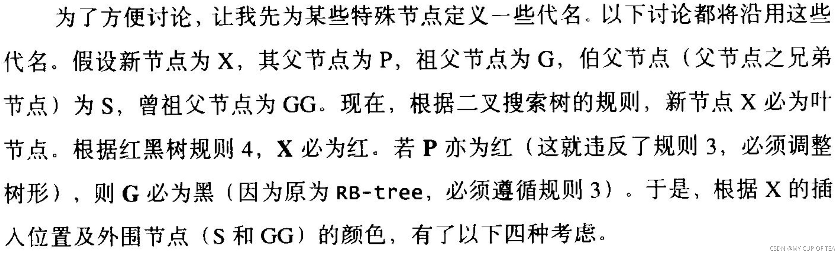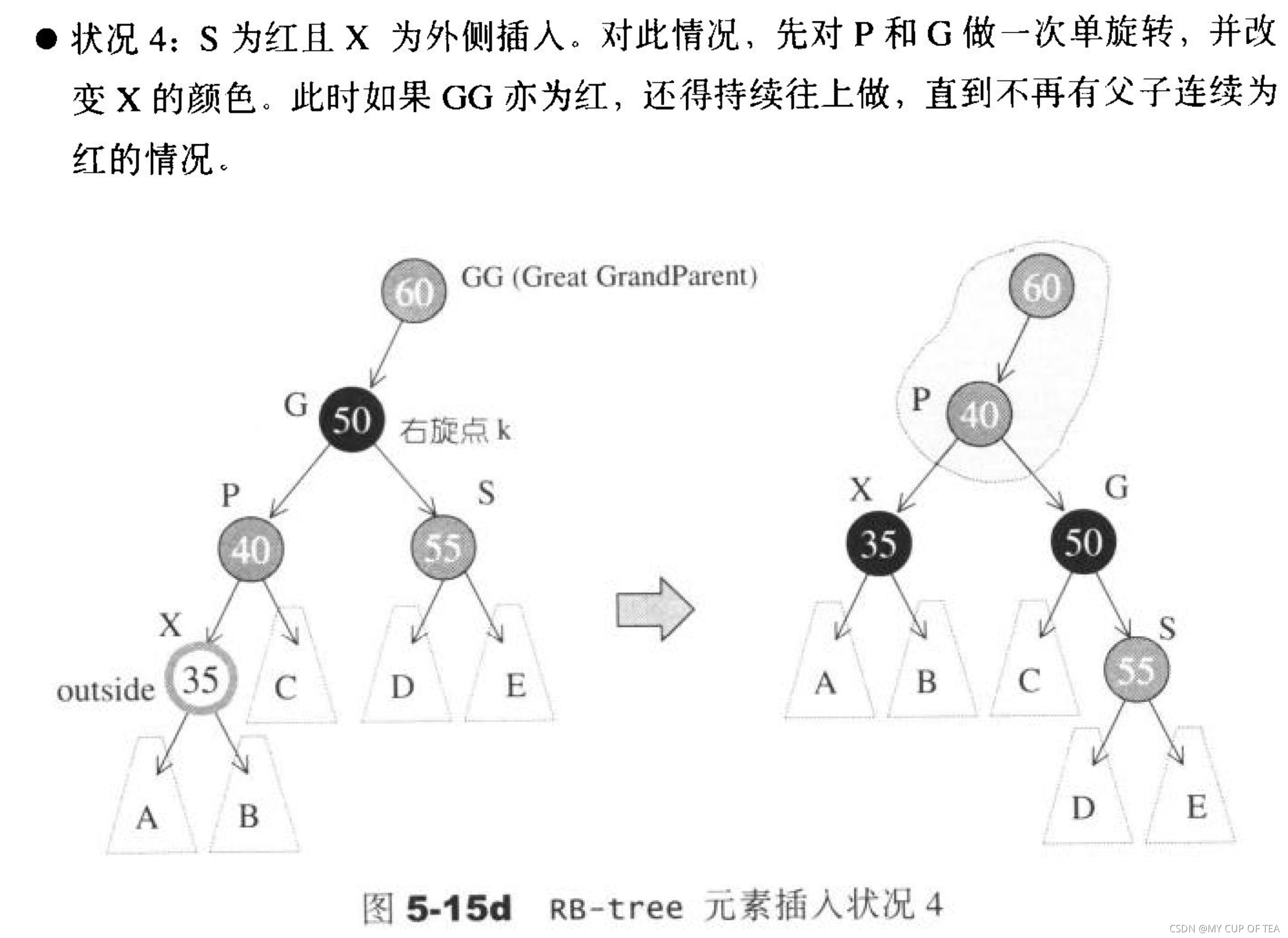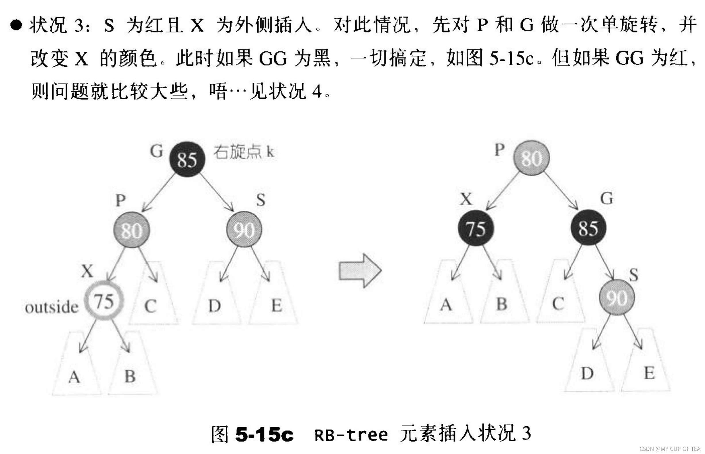 inline void __rb_tree_balance(__rb_tree_node_base* x,__rb_tree_node_base*& root){x->color = __rb_tree_red; //新节点的颜色必须是红色的while(x!=root && x->parent->color == __rb_tree_red){//父节点为红色的//父节点为祖父节点的左子节点if (x->parent == x->parent->parent->left){//令y为伯父节点__rb_tree_node_base* y = x->parent->right;if (y && y->color == __rb_tree_red){ //伯父节点存在 且为红x->parent->color = __rb_tree_black;//更改父节点的颜色为黑y->color = __rb_tree_black;//更改父节点的颜色为黑x->parent->parent->color = __rb_tree_red;//更改祖父节点的颜色为红x = x->parent->parent;} else{//无伯父节点 或者伯父节点的颜色为黑if (x == x->parent->right){//新节点为父节点的右子节点x = x->parent;//第一次参数为左旋节点__rb_tree_rotate_left(x,root);}x->parent->color = __rb_tree_black;//改变颜色x->parent->parent->color = __rb_tree_red;//第一次参数为右旋节点__rb_tree_rotate_right(x->parent->parent,root);}} else{//父节点为祖父节点的右子节点__rb_tree_node_base* y = x->parent->parent->left; //令y为伯父节点if (y && y->color == __rb_tree_red){ //存在伯父节点,且为红x->parent->color = __rb_tree_black;//更改父节点为黑y->color = __rb_tree_black;//更改伯父节点为黑x->parent->parent->color = __rb_tree_red; //更改祖父节点为红x = x->parent->parent; //准备继续往上层检查} else{//无伯父节点 或者伯父节点 为黑if (x == x->parent->left){//新节点 为 父节点的左子节点x = x->parent;__rb_tree_rotate_right(x,root); //第一参数为右旋转点}x->parent->color = __rb_tree_black;//改变颜色x->parent->parent->color = __rb_tree_red;//第一参数为左旋点__rb_tree_rotate_left(x->parent->parent,root);}}} //while结束root->color = __rb_tree_black;
