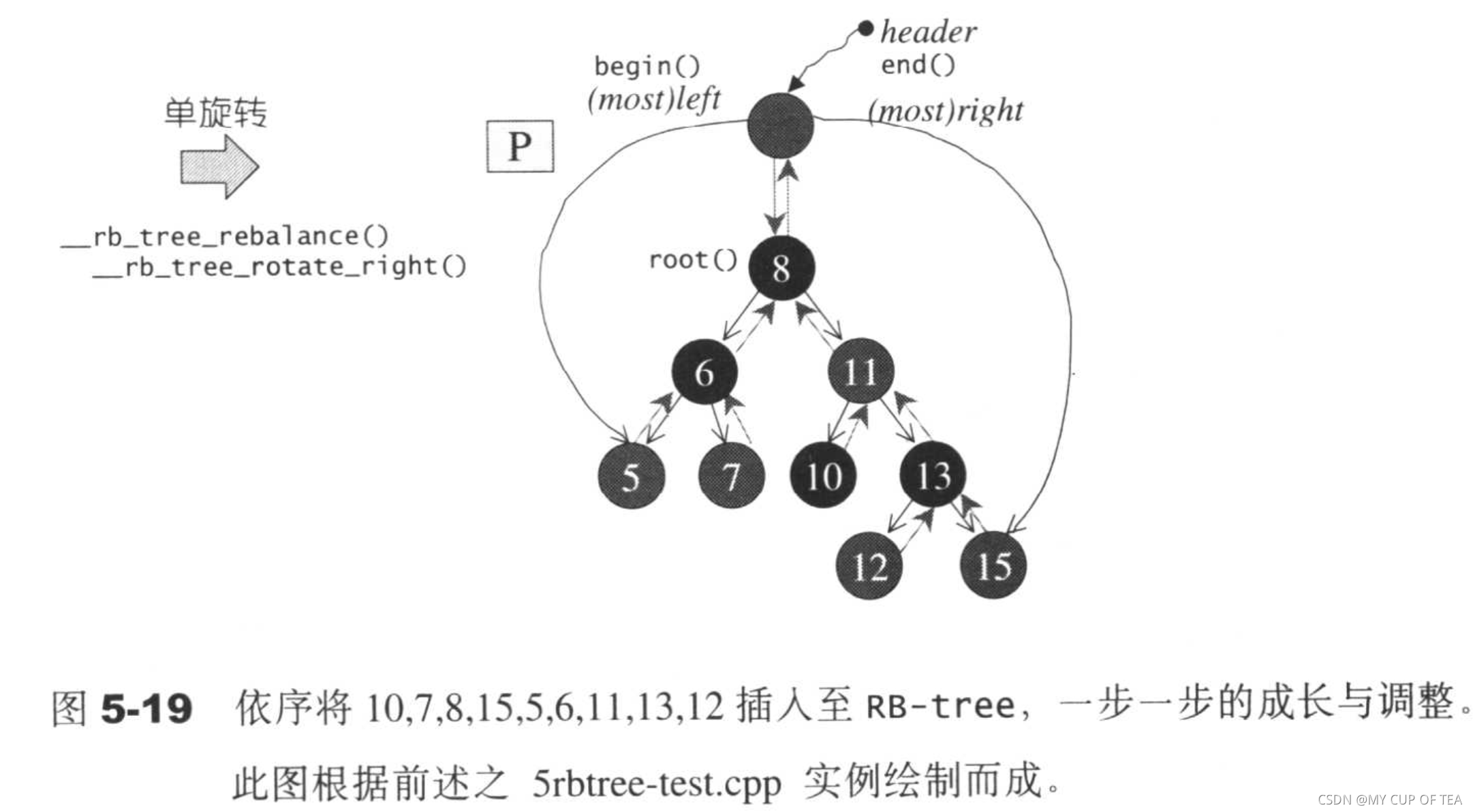 - RB-Tree属于双向迭代器,但是不具备随机定位的能力,其提领操作和成员访问和list十分类似。较为特殊的是前进和后退操作。