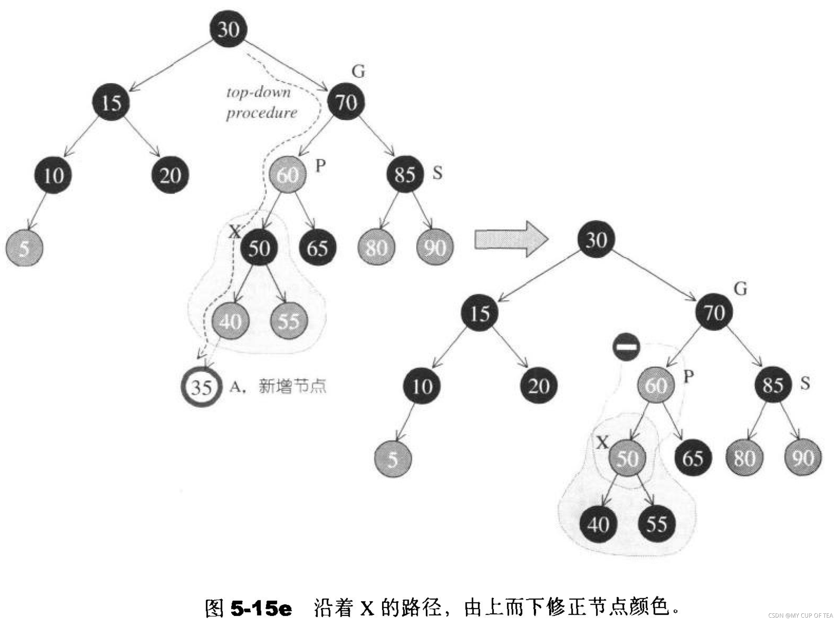 - 实现一个由上到下的程序,主要目的是检测节点 X 的两个孩子节点是不是红色,如果都是红色就将自己改为红色,将孩子节点改为 黑色