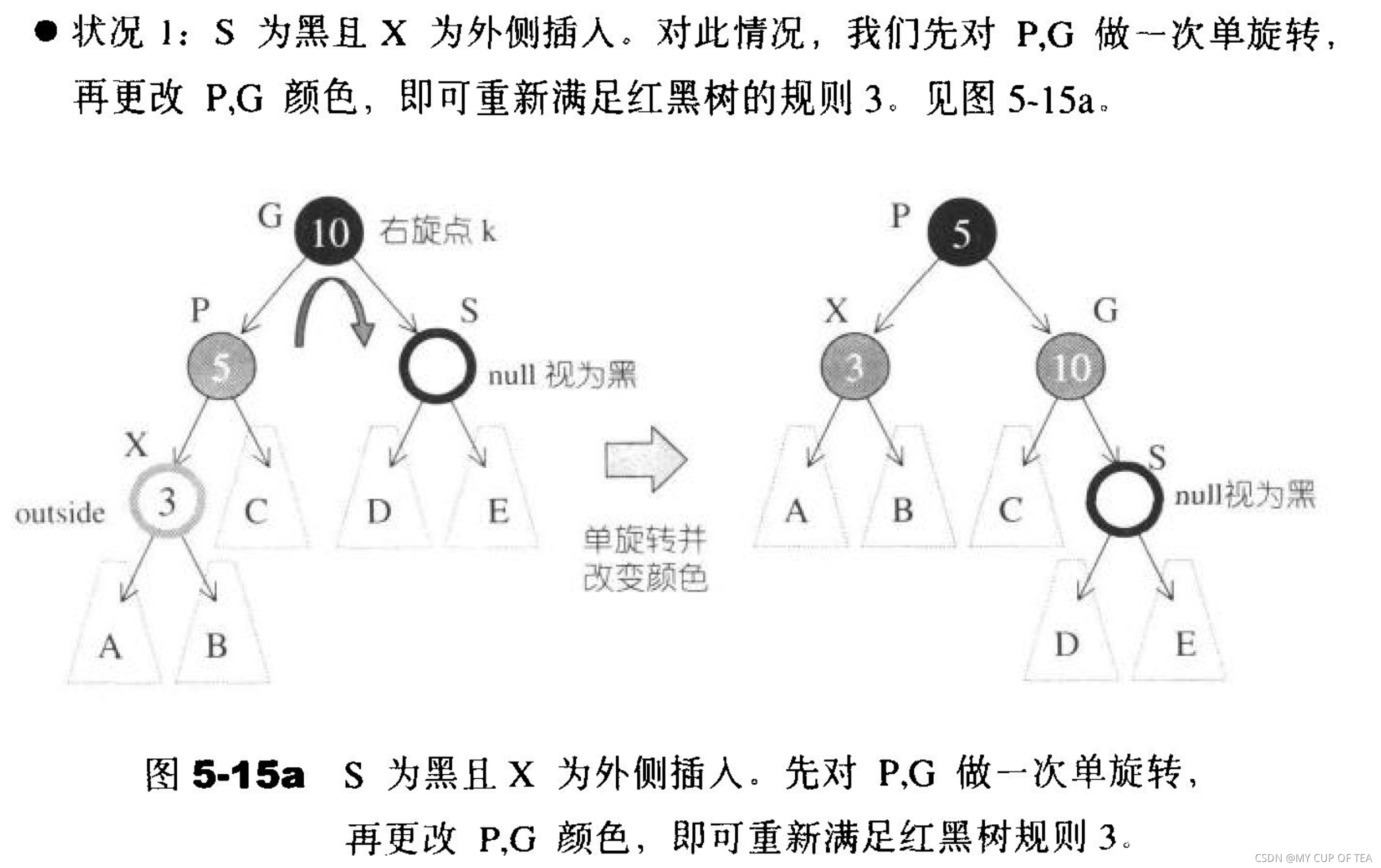 - 出现新的问题,p节点为红色,考虑到父子节点不能同时为红色(此时S绝对不能为红色),此刻就像情况一一样需要进行一次但旋转并改变颜色,或者做一次双旋转并改变颜色