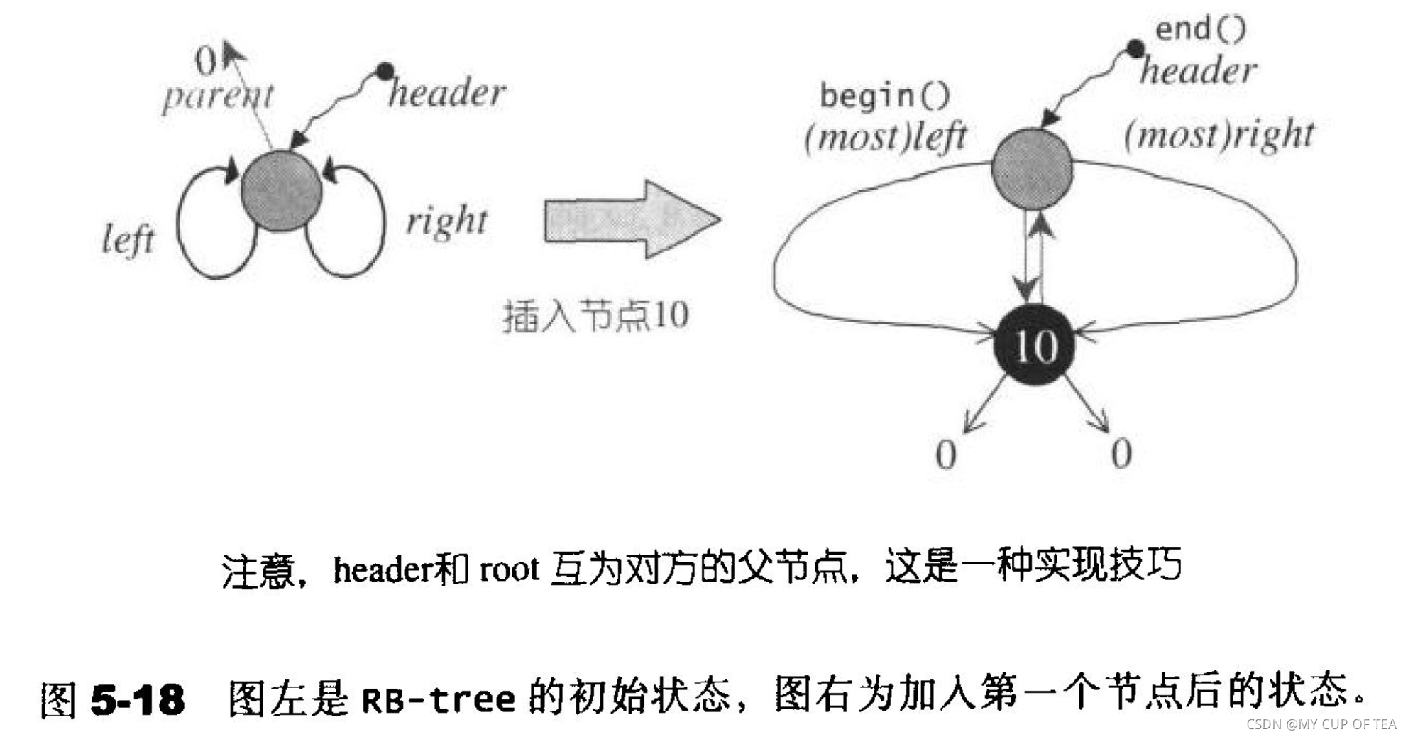 public:iterator __insert(base_ptr x,base_ptr y,const value_type& v);link_type __copy(link_type x,link_type p);void __erase(link_type x);void clear() {if (node_count != 0) {__erase(root());left_most() = header;root() = 0;right_most() = header;node_count = 0;}}void init(){header = get_node(); //产生一个节点空间 令header指向它color(header) = __rb_tree_red;//令header为红色 用于区分header和root,在iterator的operator++中root() == 0;left_most() = header; //令header的左子节点等于自己right_most() = header; //令header的右子节点等于自己}