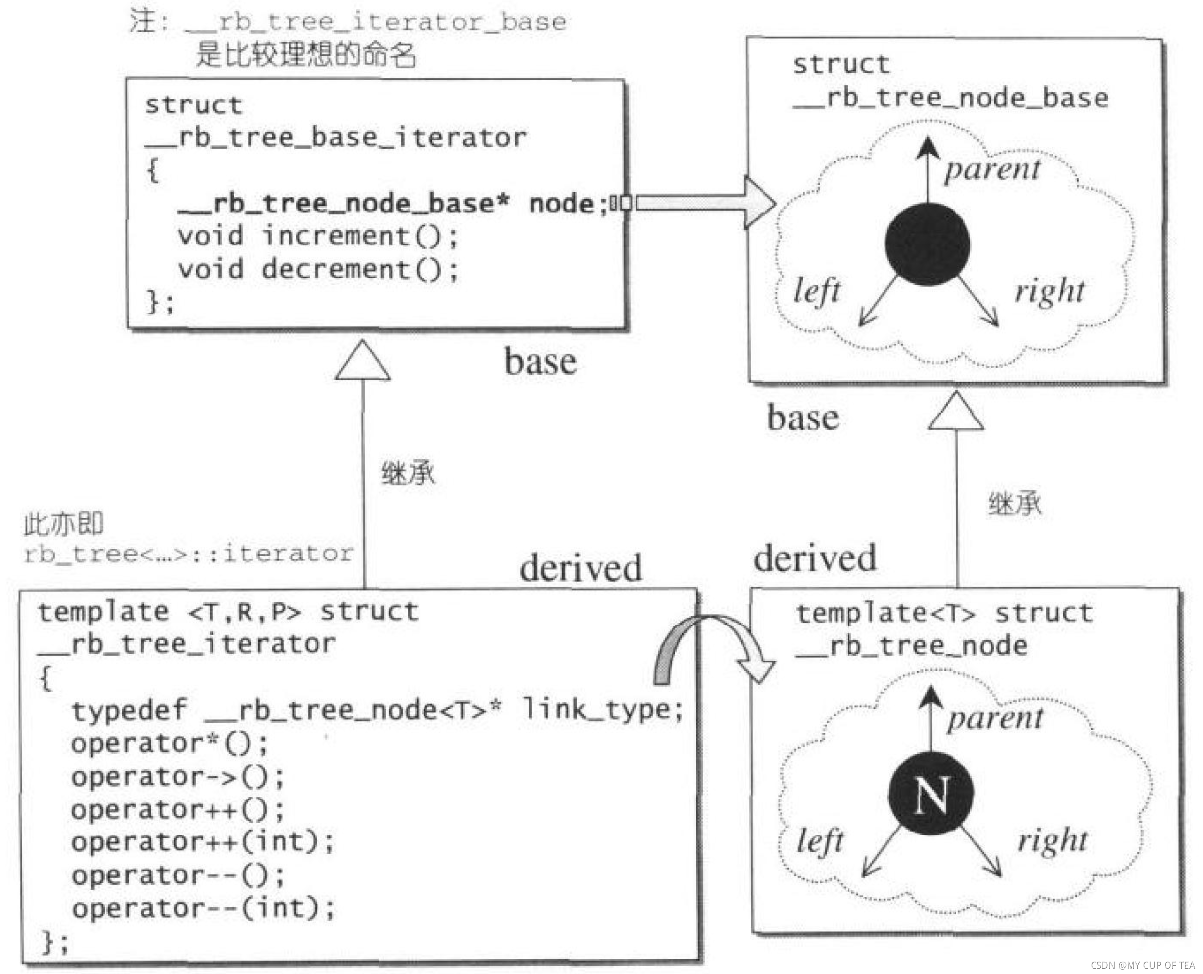 struct __rb_tree_iterator : public __rb_tree_base_iterator{typedef Value value_type;typedef Ref reference;typedef Ptr pointer;typedef __rb_tree_iterator<Value,Value&,Value*> iterator;typedef __rb_tree_iterator<Value,const Value&,const Value*> const_iterator;typedef __rb_tree_iterator<Value,Value&,Value*> self;typedef __rb_tree_node<Value>* link_type;__rb_tree_iterator(){}__rb_tree_iterator(link_type x){node = x;}__rb_tree_iterator(const iterator& it){node = it.node;}reference operator* () const {return link_type(node)->value_field; }#ifndef __SGI_STL_NO_ARROW_OPERATORreference operator->()const {return &(operator*());}