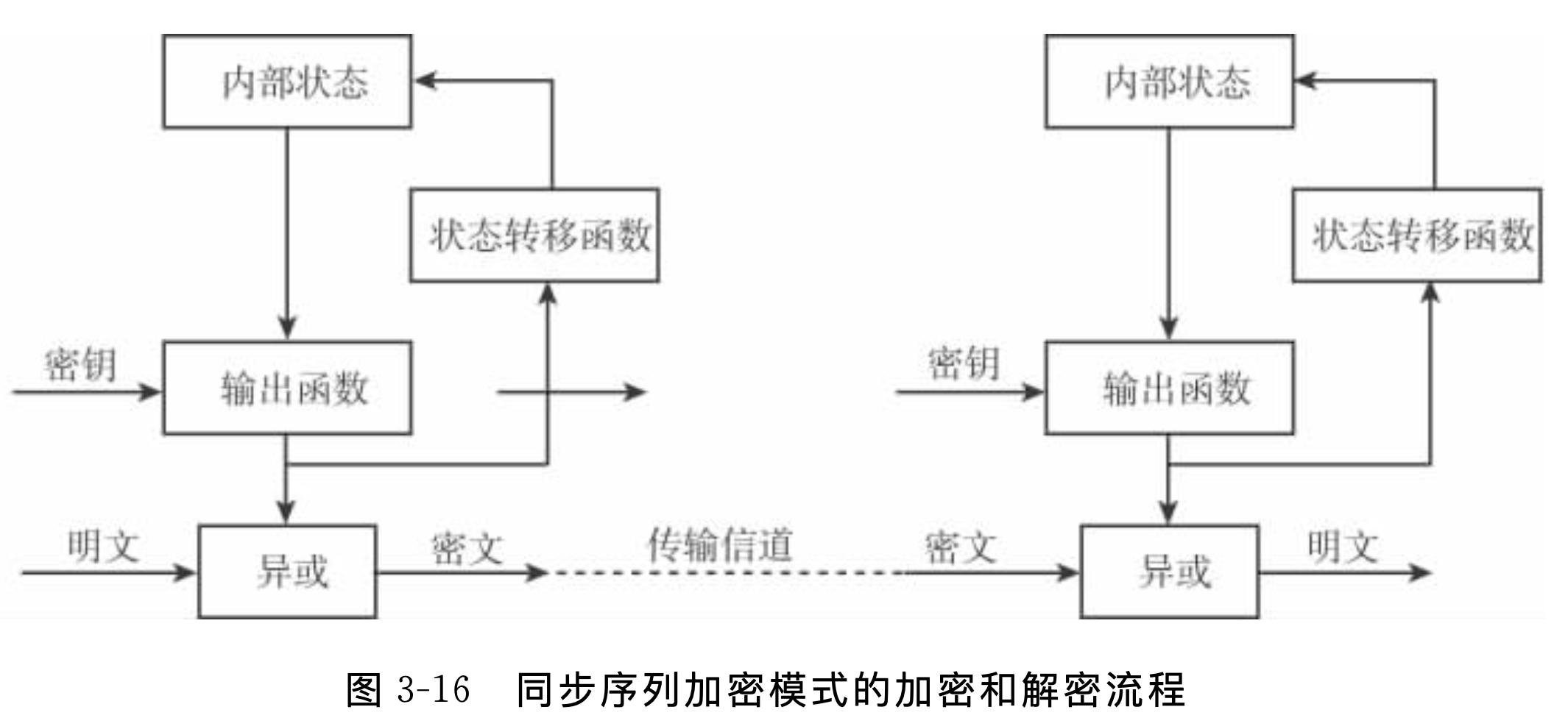 -  同步序列加密模式又称为密钥自动密钥加密,它的特点是密钥序列的产生跟处理的消息是不相关,相互独立的。如图所示是同步序列加密模式的加密和解密流程。