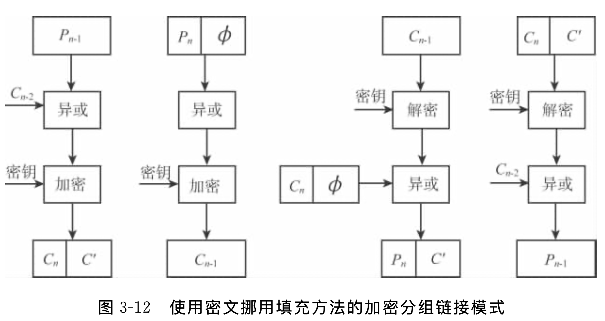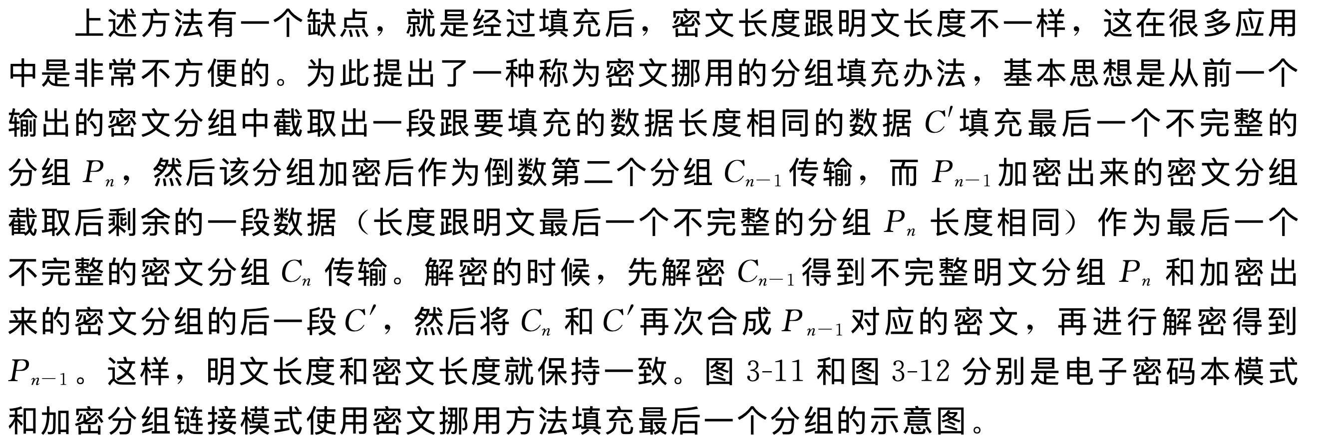 - 上述方法有一个缺点,就是经过填充后,密文长度跟明文长度不一样,这在很多应用 中是非常不方便的。为此提出了一种称为密文挪用的分组填充办法