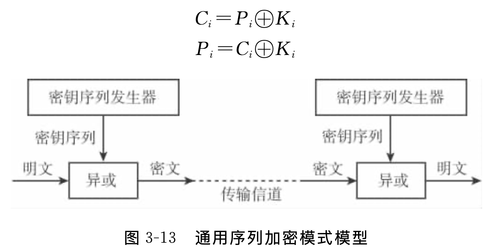 - 假设密钥序列发生器的输出位序列为K 1,K2 ,K3 ......,明文输入为P 1,P2,P3......,密文输出用C1、C2、C3......表示,序列加密模式可以使用公式如下