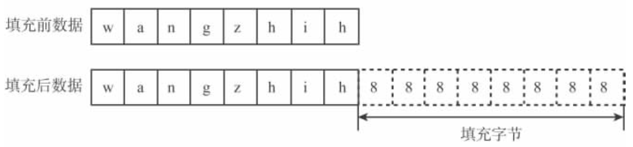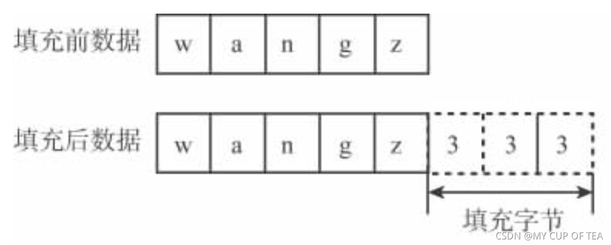 - 例 如分组长度位是8字节 (64位),最后一个分组长度为5个字节,那么需要填充的字节是3,那么就使用数值3填充最后的3个字节。