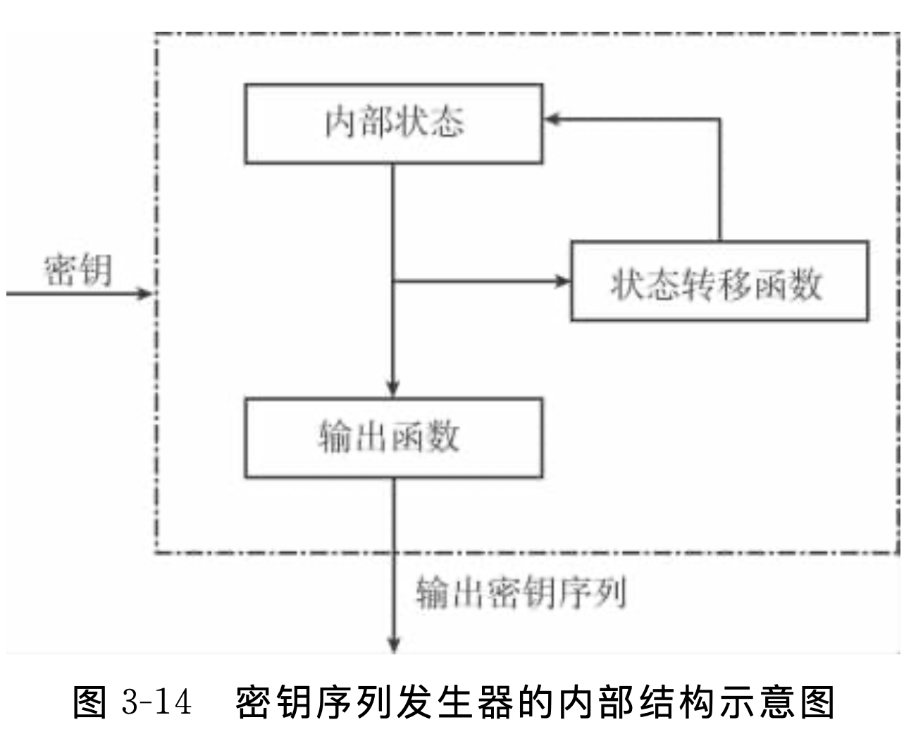 - 一个密钥序列发生器理论上可以抽象为三部分:内部状态、状态转移函数及输出函数,如图所示。内部状态描述了密钥序列发生器当前的内部状态,对于一个同样结构的密钥序列发生器,相同的内部状态应该输出相同的密钥序列,否则就不可能进行正确的 加密和解密。状态转移函数描述了从当前状态转移到下一个状态的规则,从而产生一个新的状态。输出函数对内部状态进行计算等处理,从而输出密钥序列。在实际应用中,这些组件的划分有时候并非那么明确。对于密钥序列发生器来说,密钥可以看作是对其内部状 态进行初始化或重置的向量。