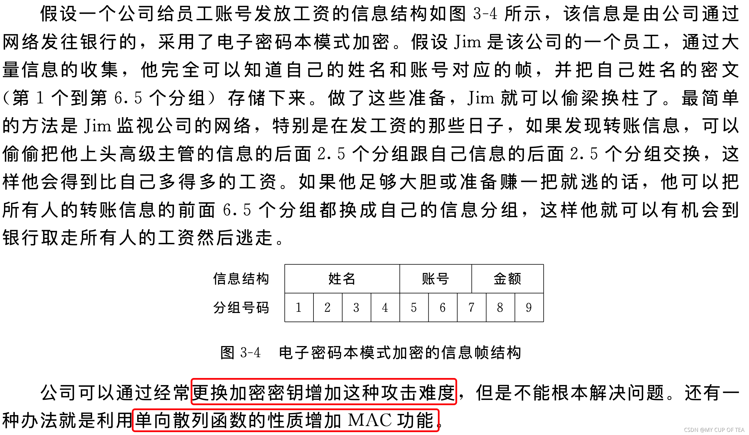 - 加密分组链接模式 (CBC)可以解决电子密码本模式(ECB)容易受到分组替换攻击的问题。