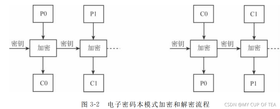 -  电子密码本模式 (ECB)是最简单的分组加密模式,也是最能体现 “分组”概念的加 密模式。它将加密的数据分成若干组,每组的大小跟加密密钥长度相同,然后每组都用相 同的密钥进行加密。比如 DES算法,使用一个64位的密钥,如果采用该模式加密,就是 将要加密的数据分成每组64位的数据,如果最后一组不够64位,那么就补齐为64位, 然后每组数据都采用DES算法的64位密钥进行加密 。 如图所示是电子密码本模式的加密和解密的流程图,图中P0、P1是明文分组,C0、C1是相应的密文分组。