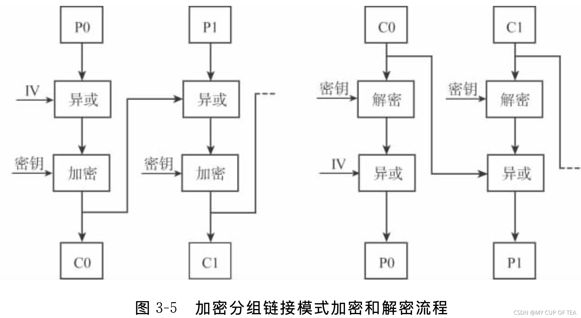 - 加密分组链接模式首先也是将明文分成固定长度的分组,然后将前面一个加密分组输出的密文与下一个要加密的明文分组进行异或操作计算,将计算结果再用密钥进行加密得到密文。第一明文分组加密的时候,因为前面没有加密的密文,所以需要一个初始化向量 (IV)。跟电子密码本模式不一样,通过链接关系,使得密文跟明文不再是一一 对应的关系,破解起来更困难,而且克服了只要简单调换密文分组就可能达到目的的攻击。加密分组链接模式的流程如图所示,其中P0、P1是明文分组,C0、C1是密文分组,IV 是初始向量。
