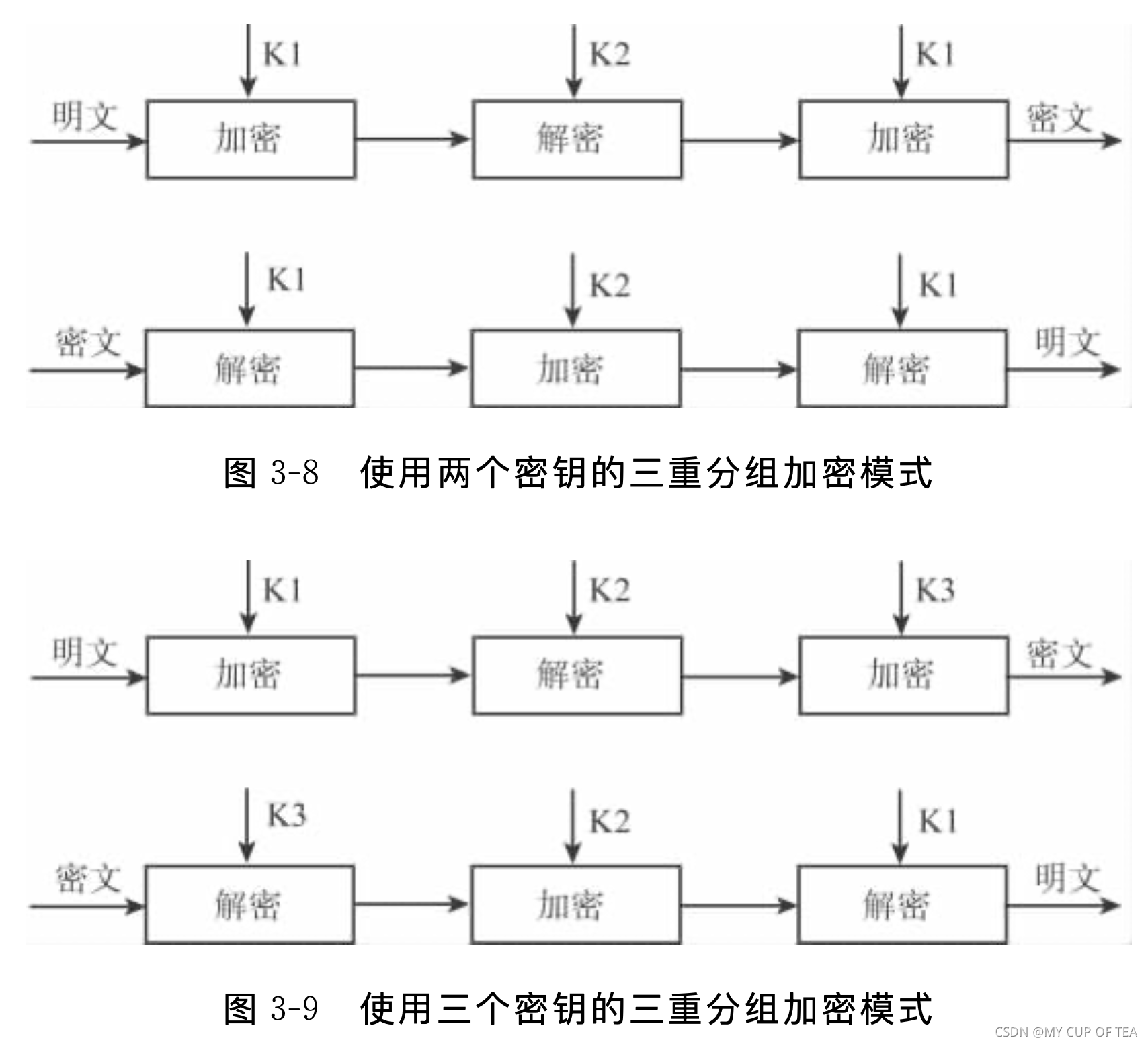 -  三重分组加密模式使用了不止一个密钥,对明文分组进行了基于基本分组加密模式的 加密、解密和加密操作。目前来说,有两种应用方式:一种是使用两个密钥,即第一个密 钥和第三个密钥相同;还有一种就是使用三个不同的密钥。图38所示是使用两个密钥的 三重分组加密模式的加密和解密流程图;图39所示是使用了三个不同密钥的三重分组加 密模式的加密和解密流程图。