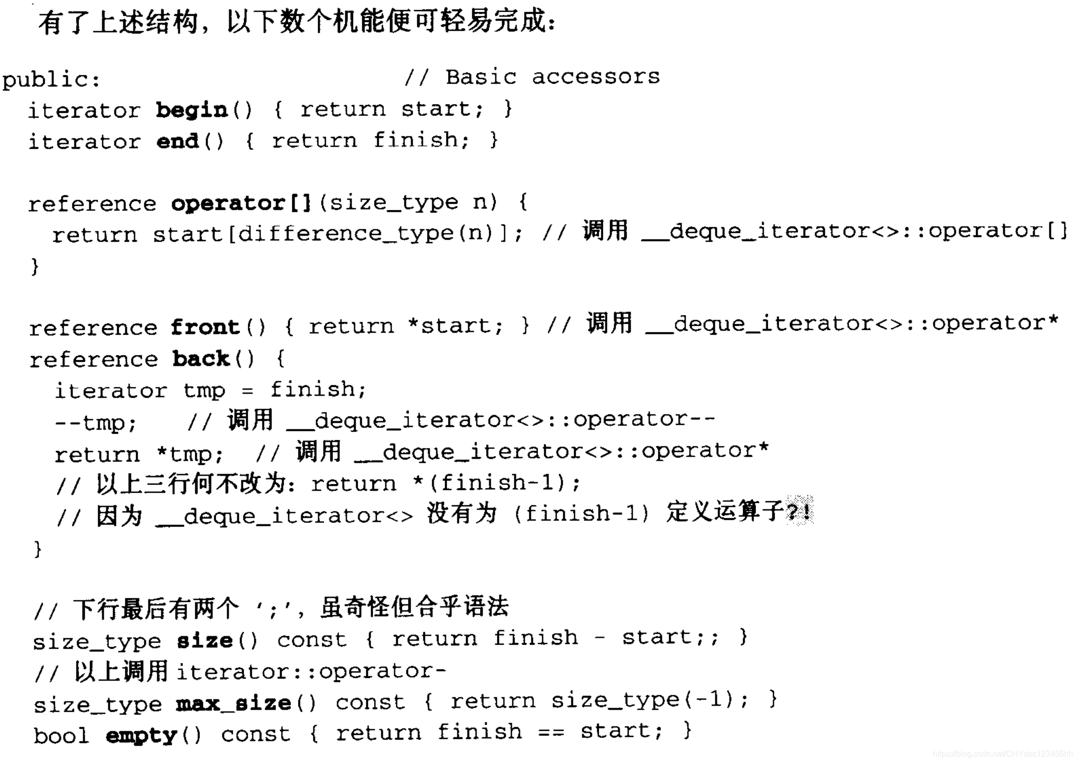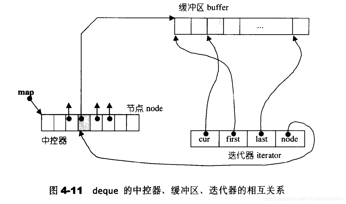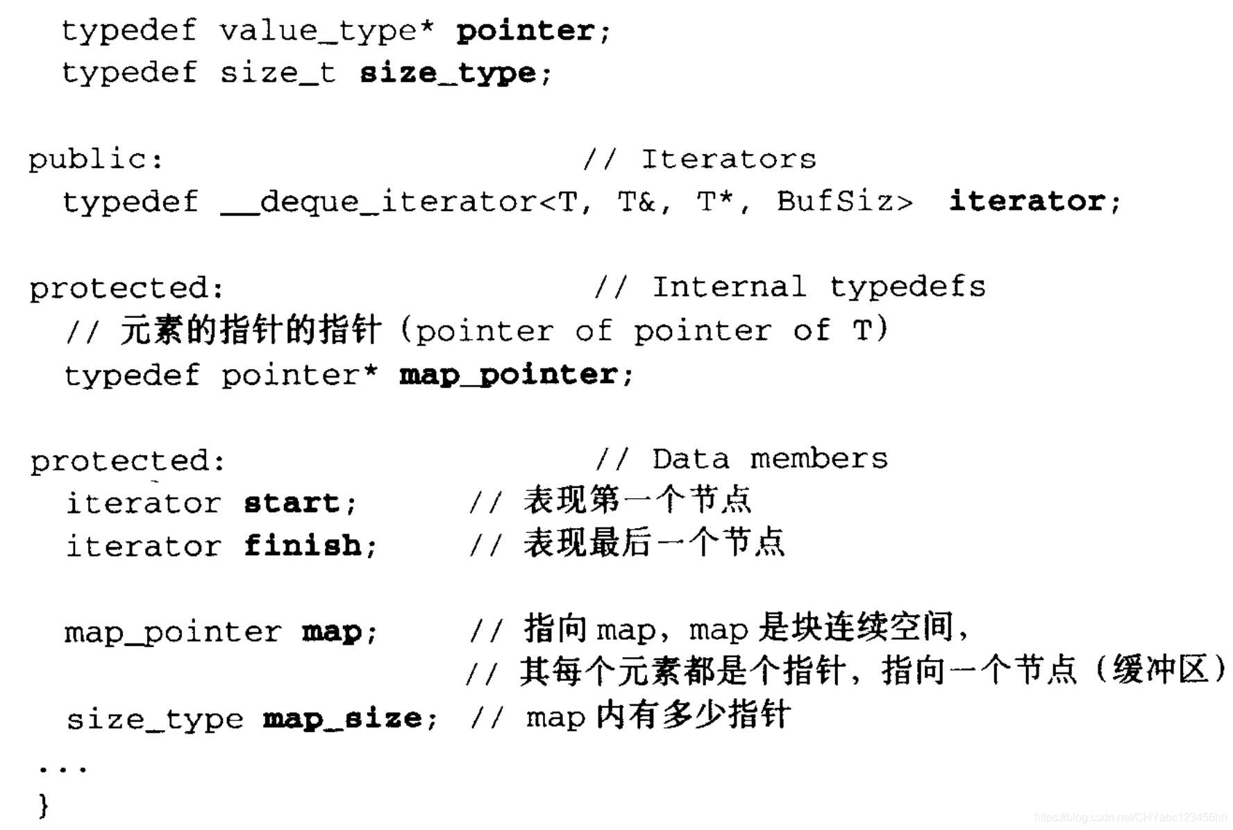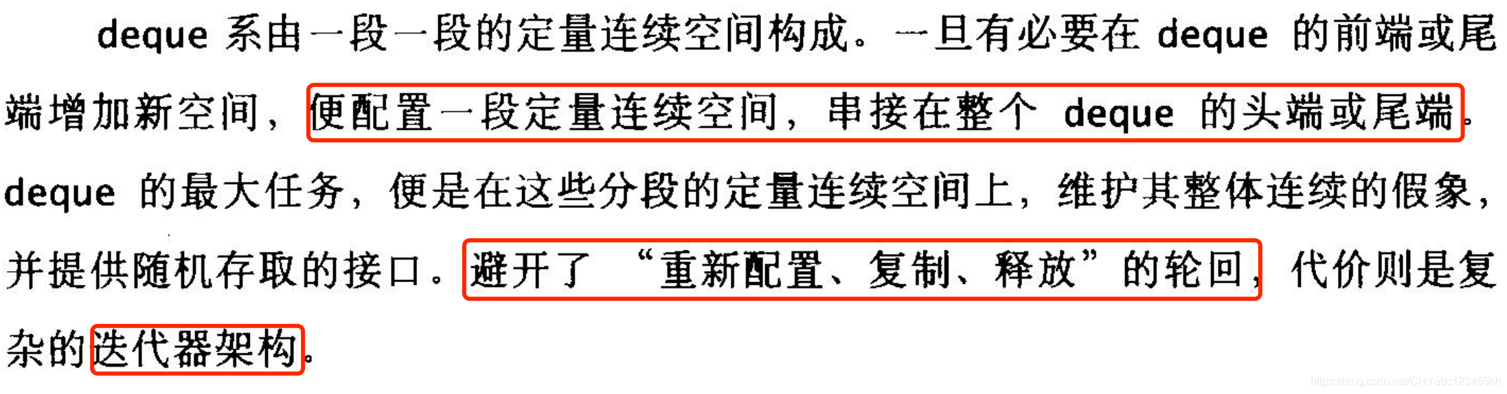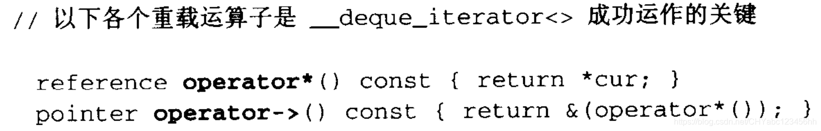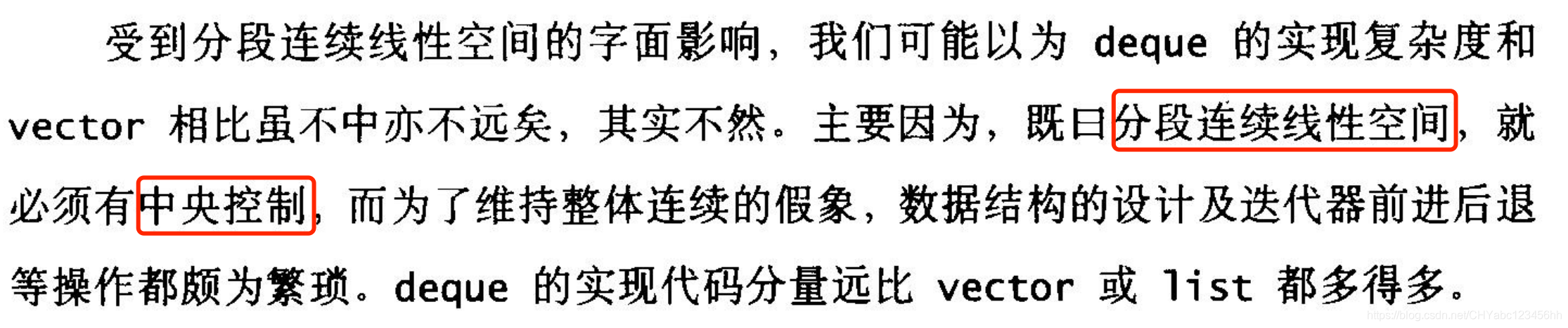 - deque是分段连续空间。维持其“整体连续”假象的任务,落在了迭代器的operator++ 和 operator--两个运算子身上。