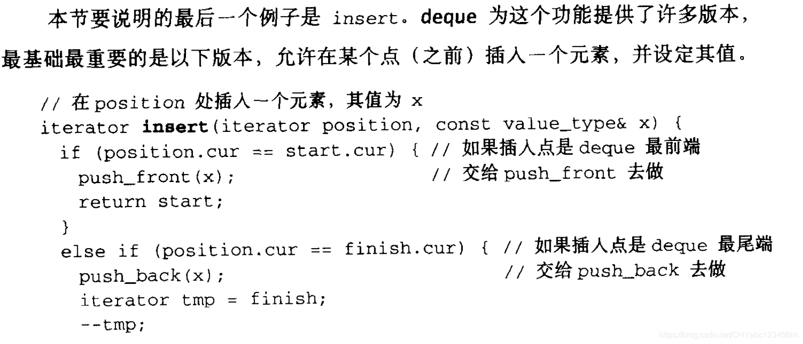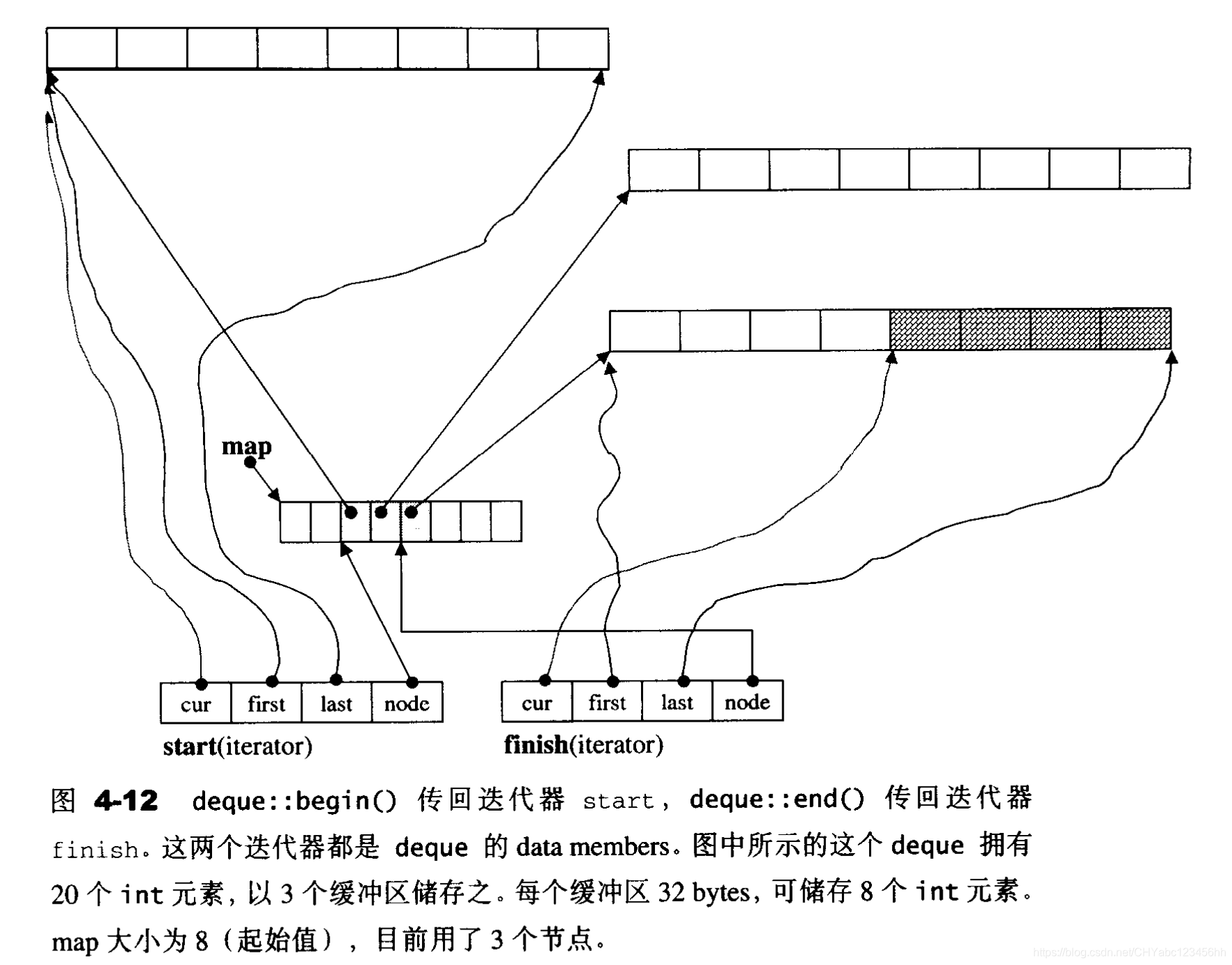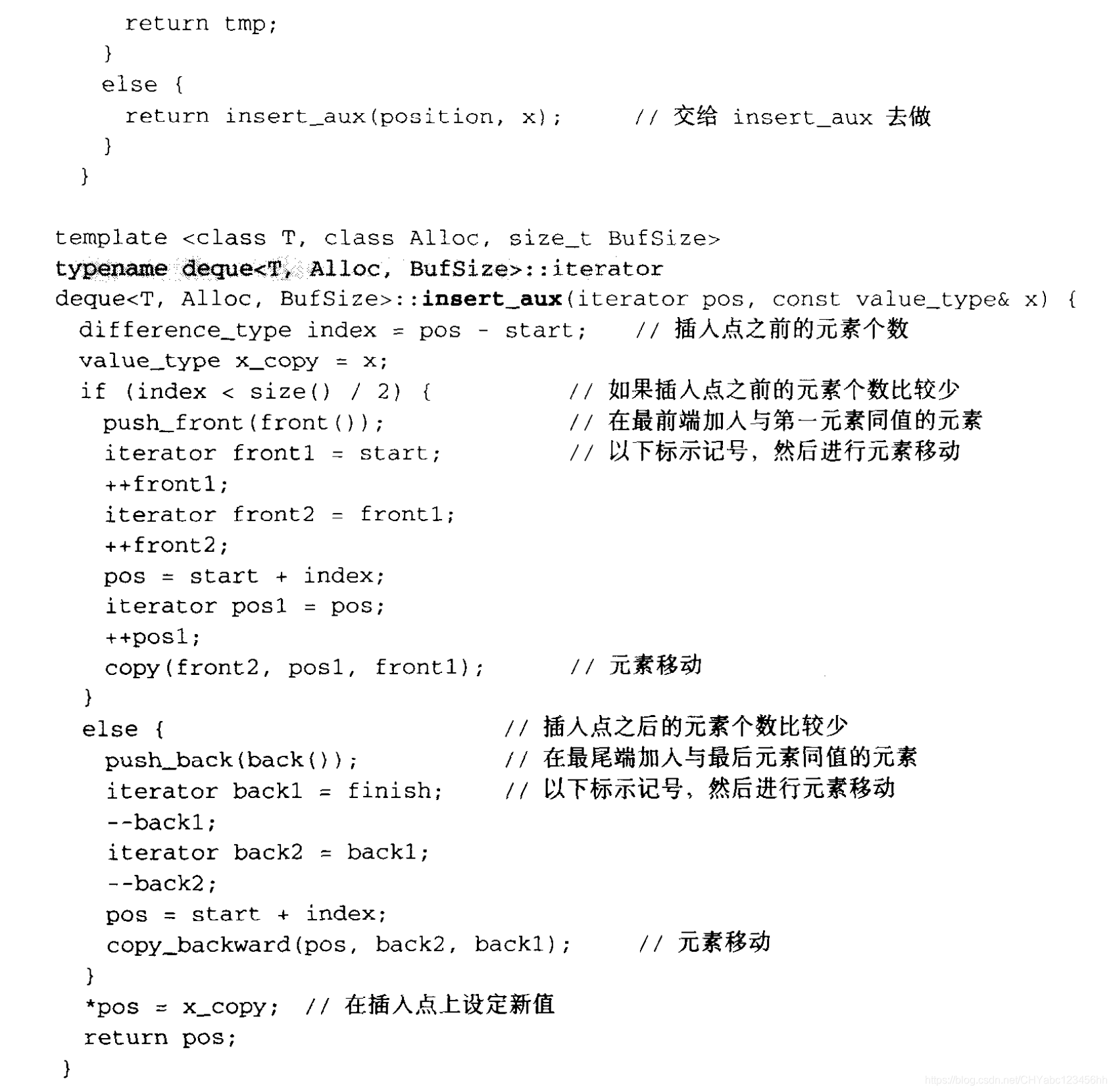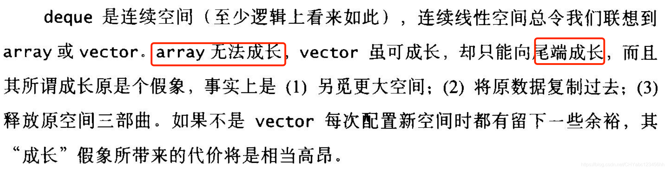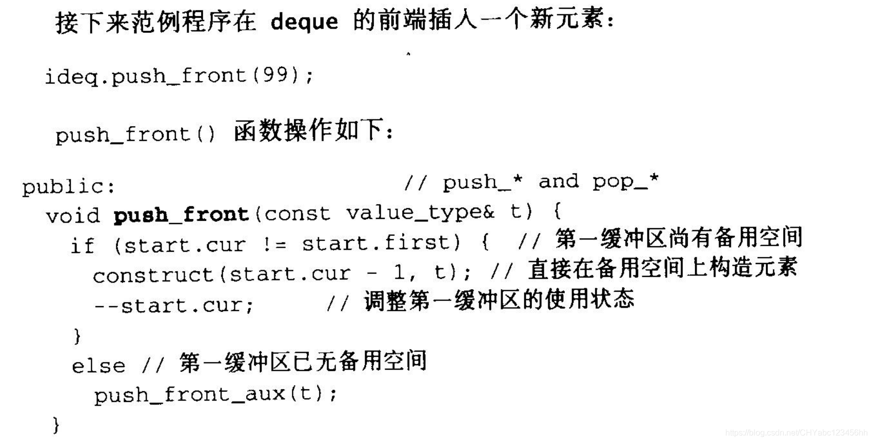 - deque是分段连续空间。维持其“整体连续”假象的任务,落在了迭代器的operator++ 和 operator--两个运算子身上。