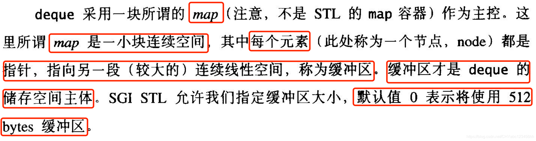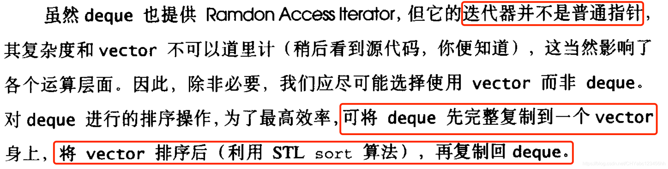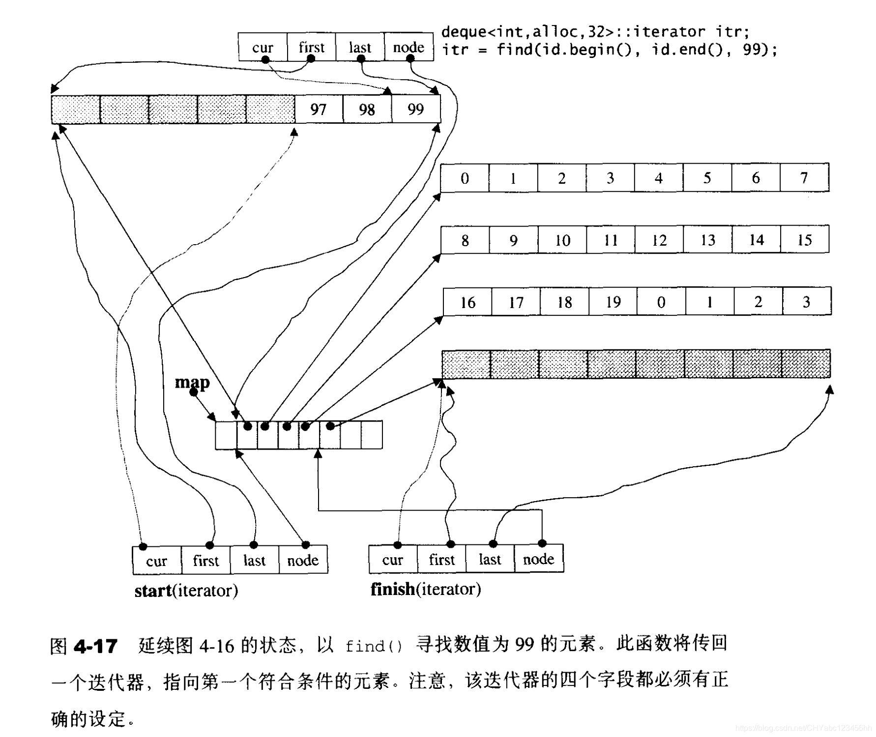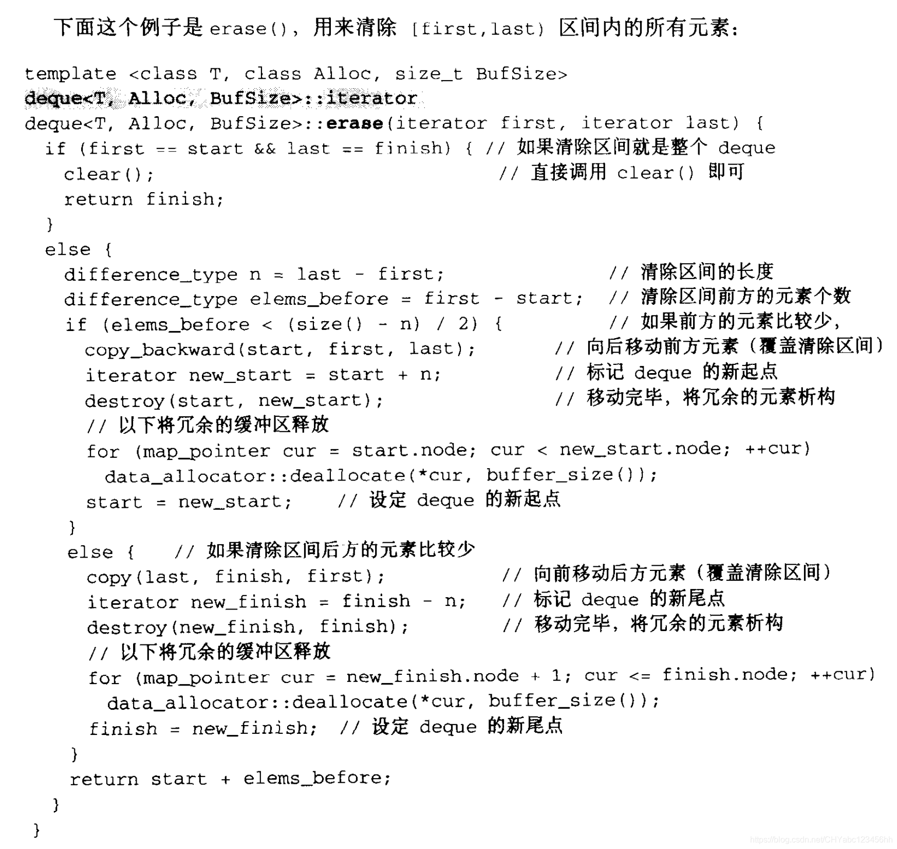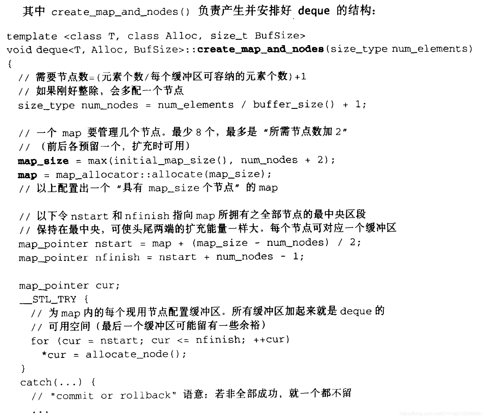 - deque是分段连续空间。维持其“整体连续”假象的任务,落在了迭代器的operator++ 和 operator--两个运算子身上。