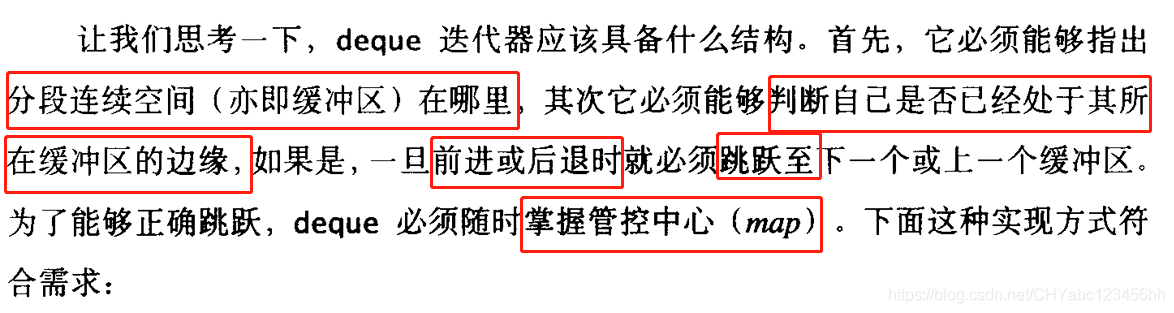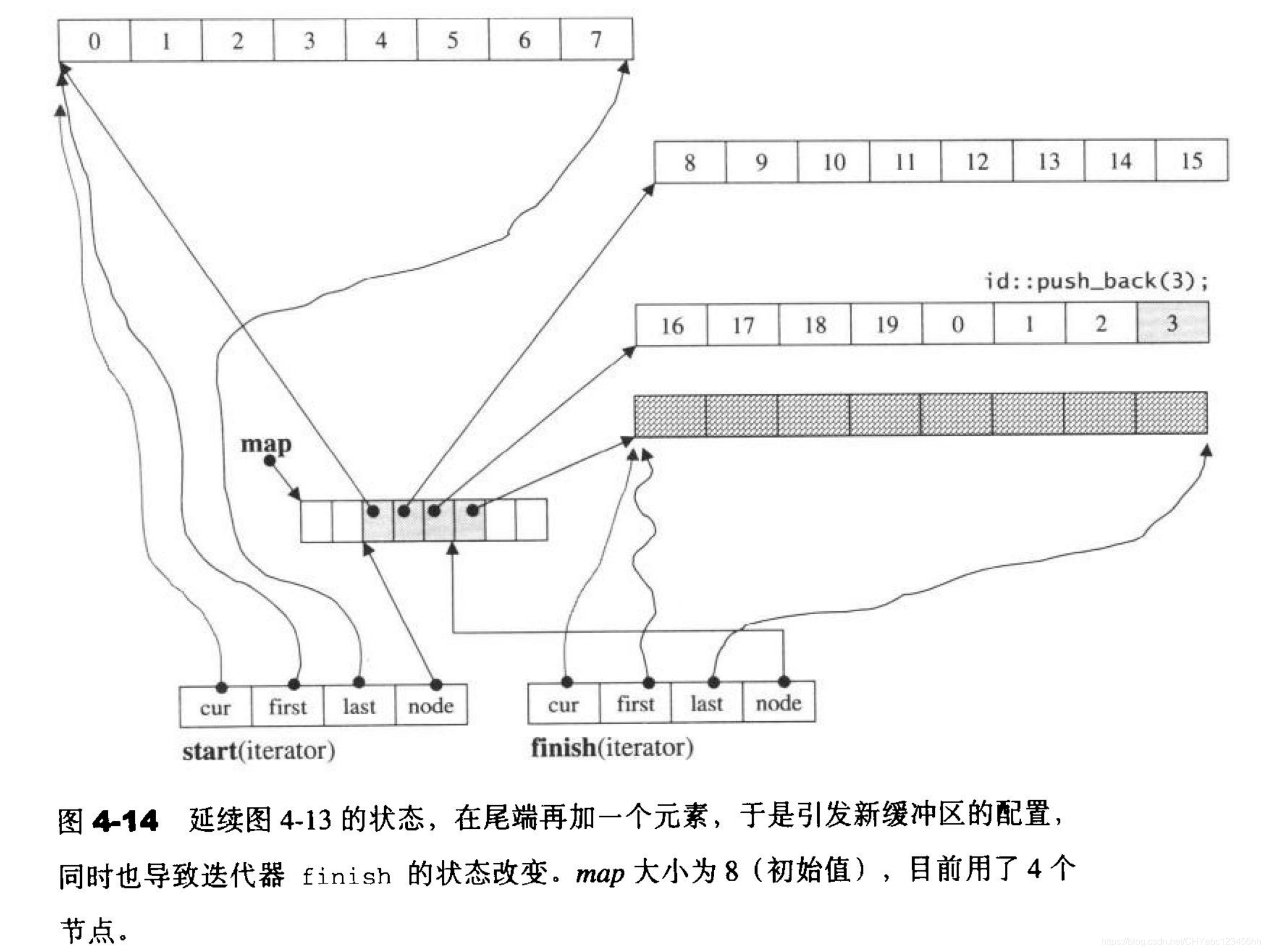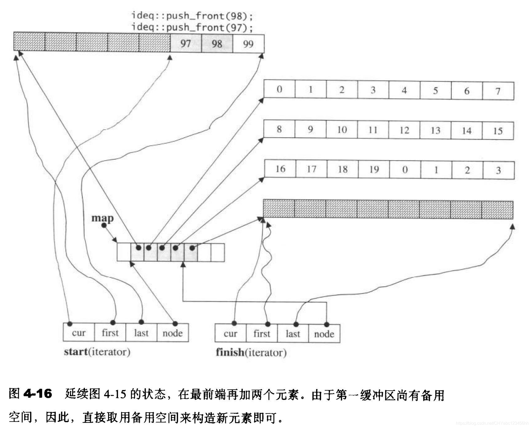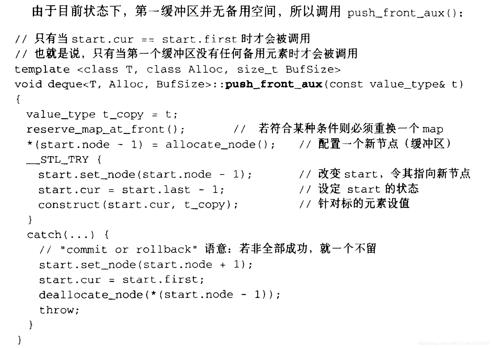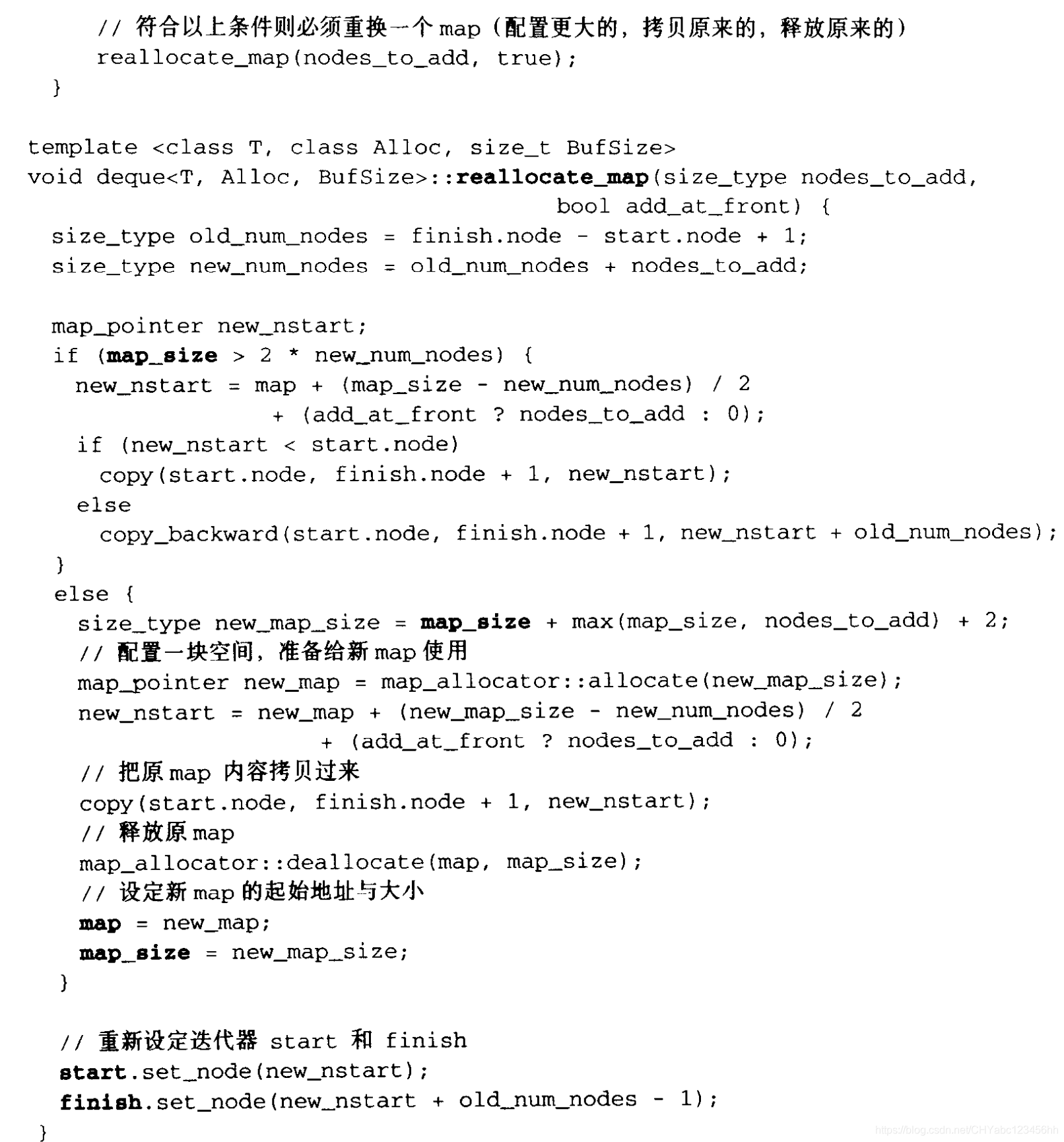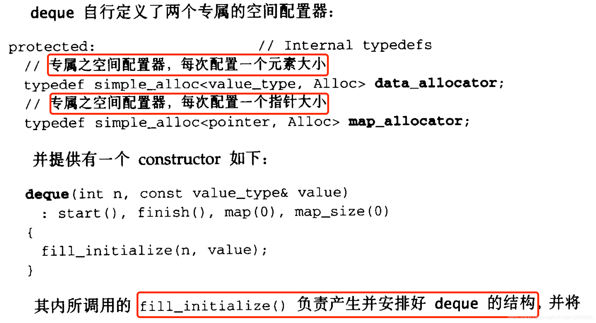 - deque是分段连续空间。维持其“整体连续”假象的任务,落在了迭代器的operator++ 和 operator--两个运算子身上。