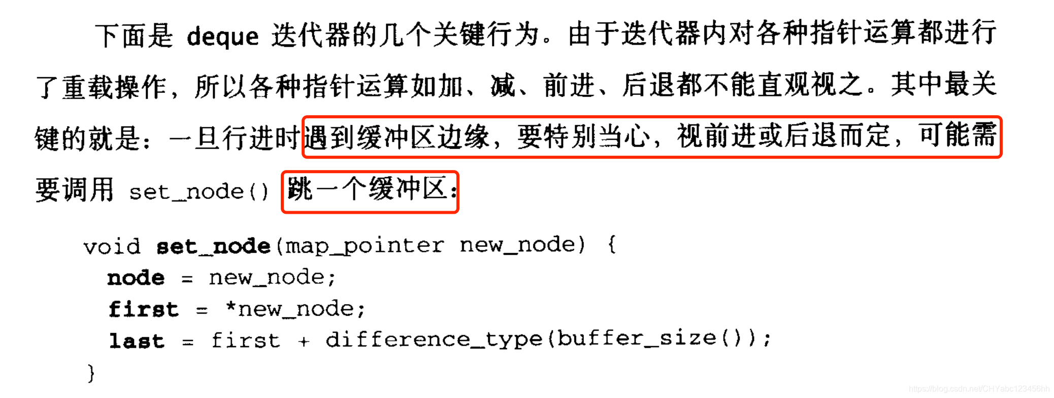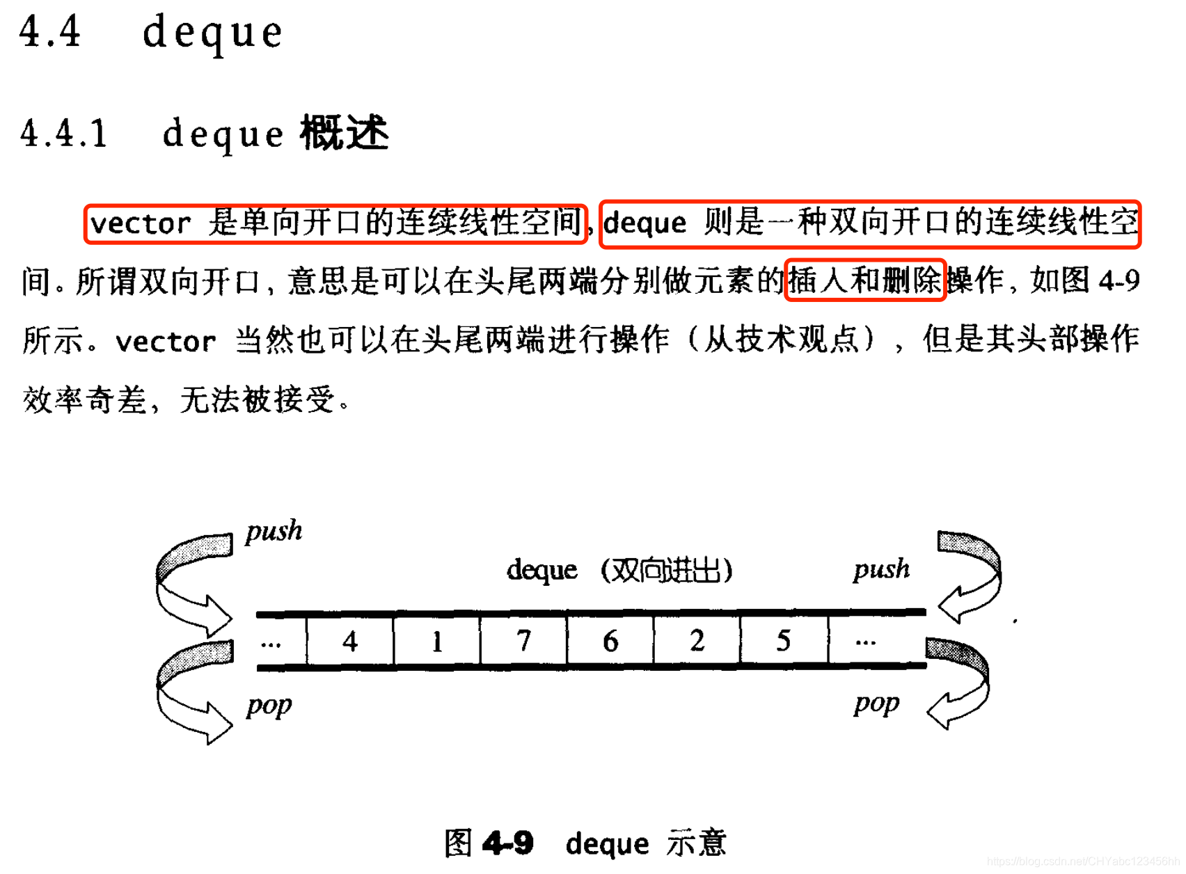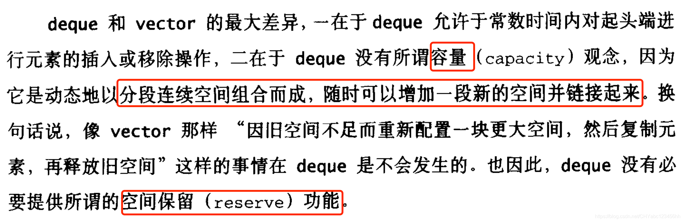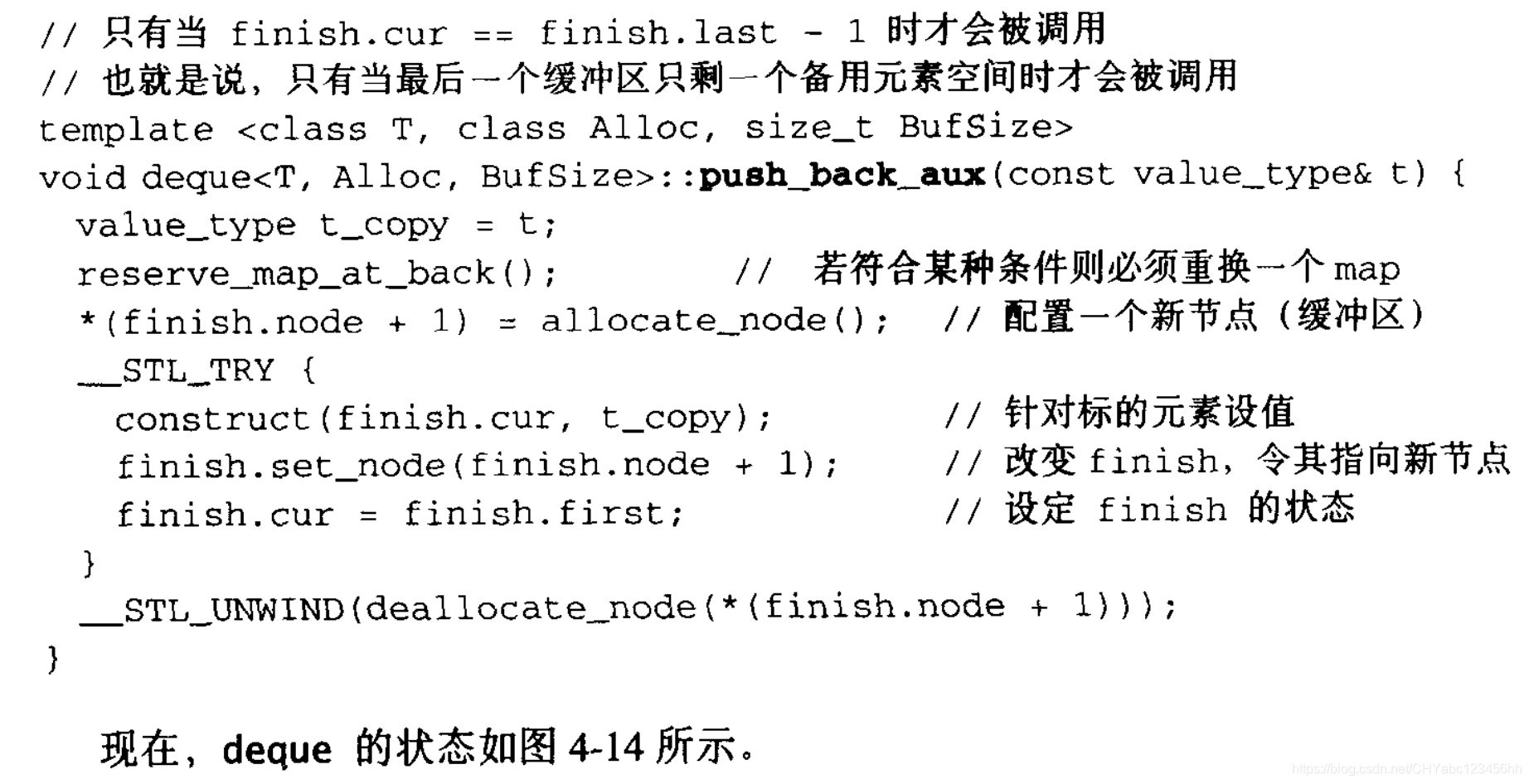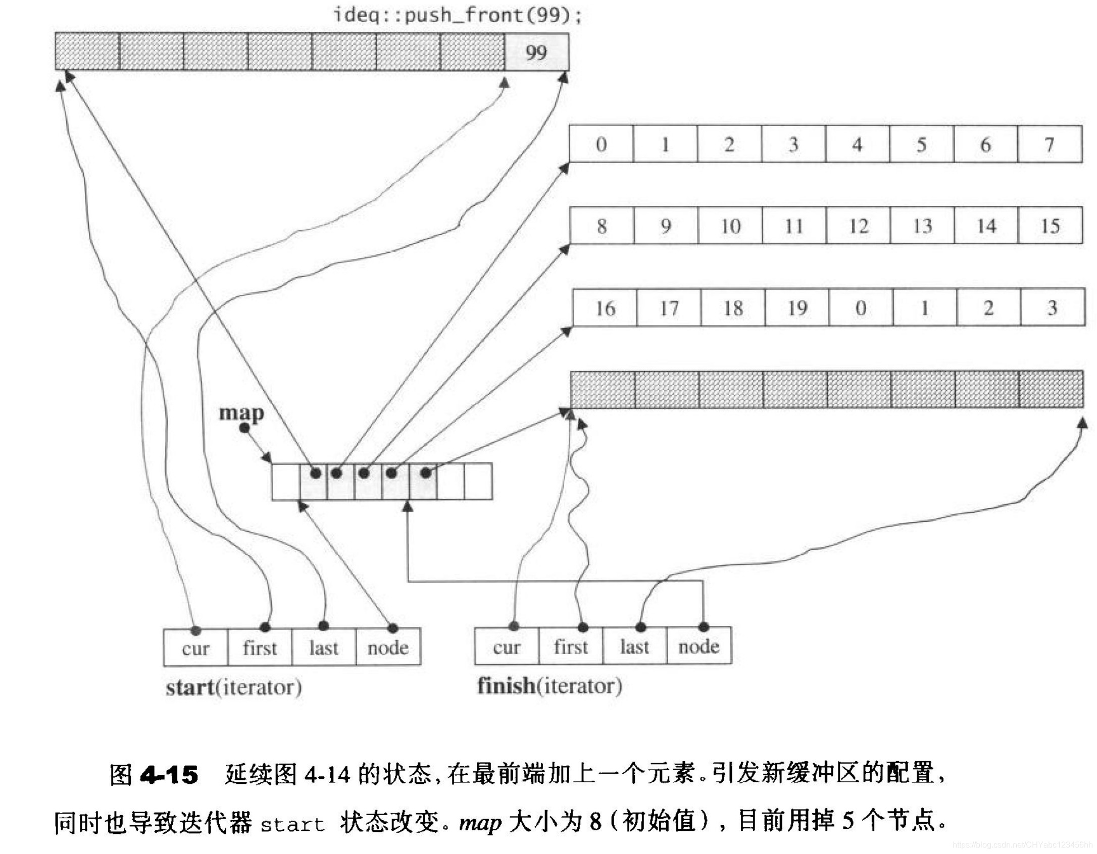 - deque是分段连续空间。维持其“整体连续”假象的任务,落在了迭代器的operator++ 和 operator--两个运算子身上。