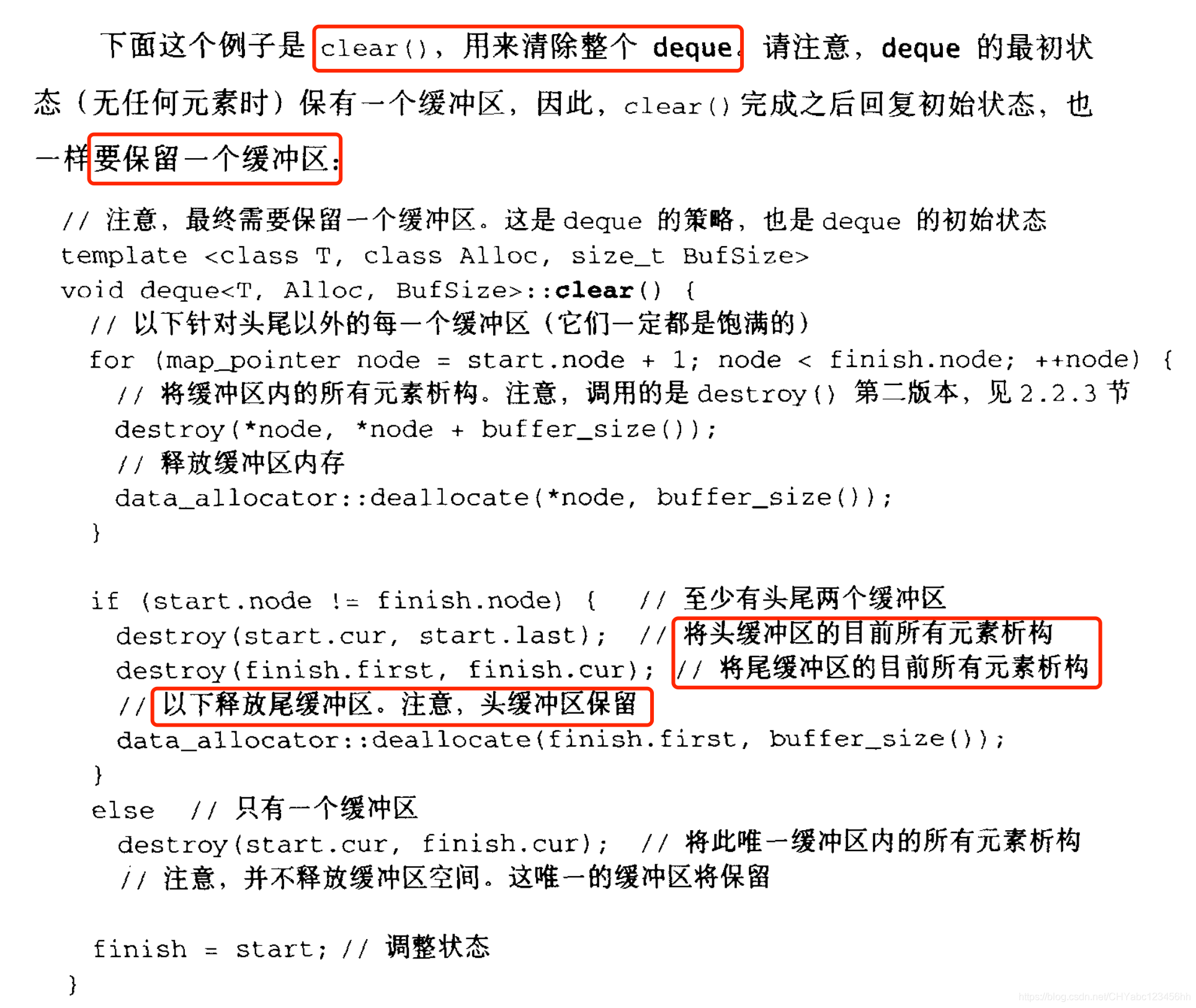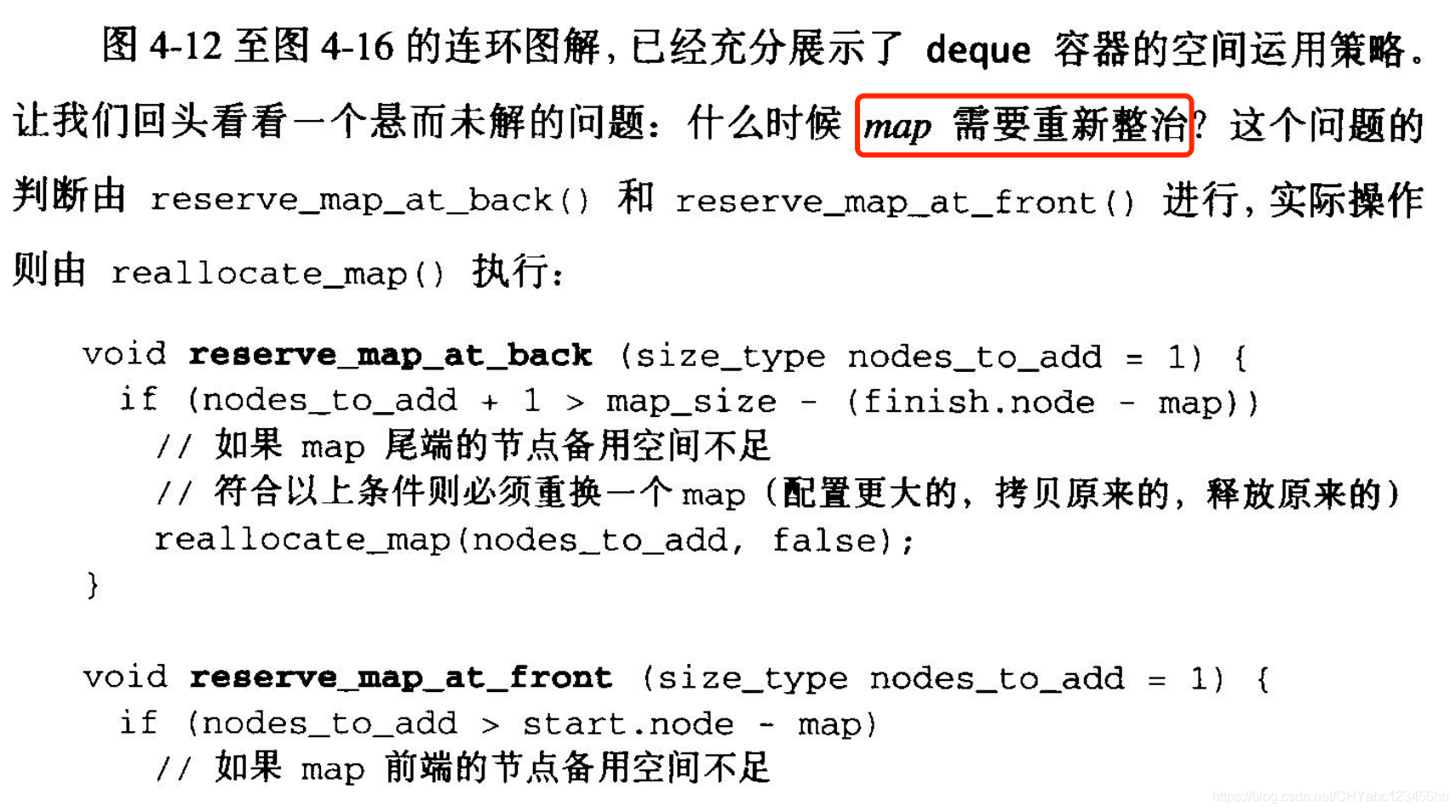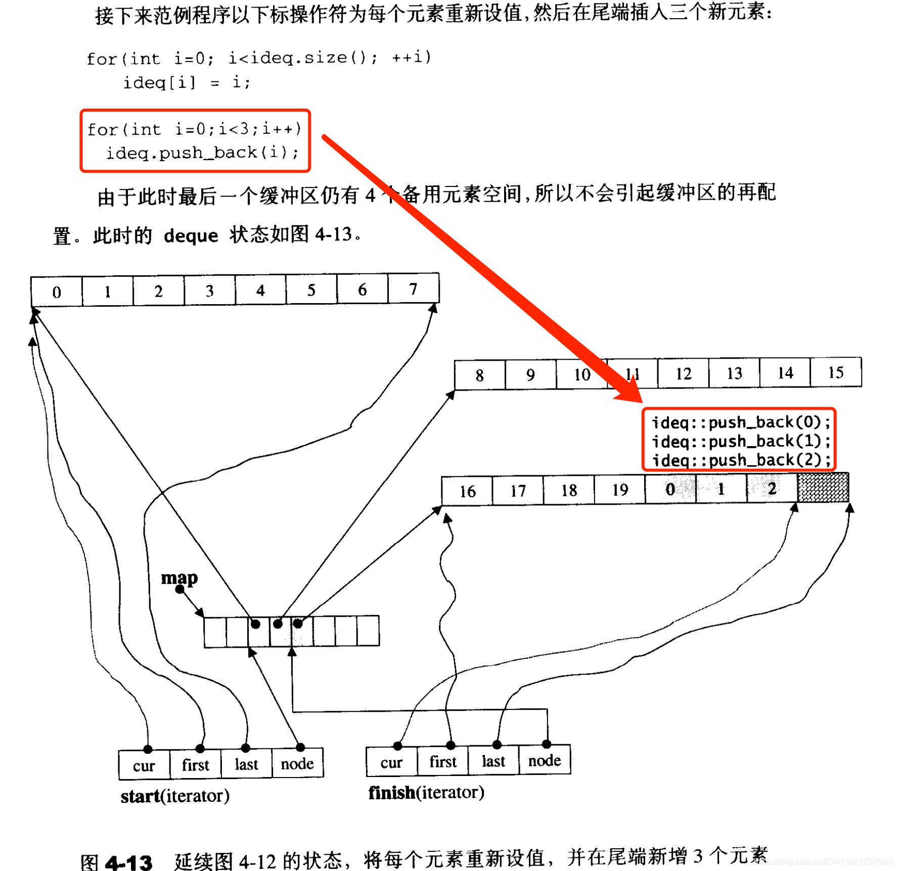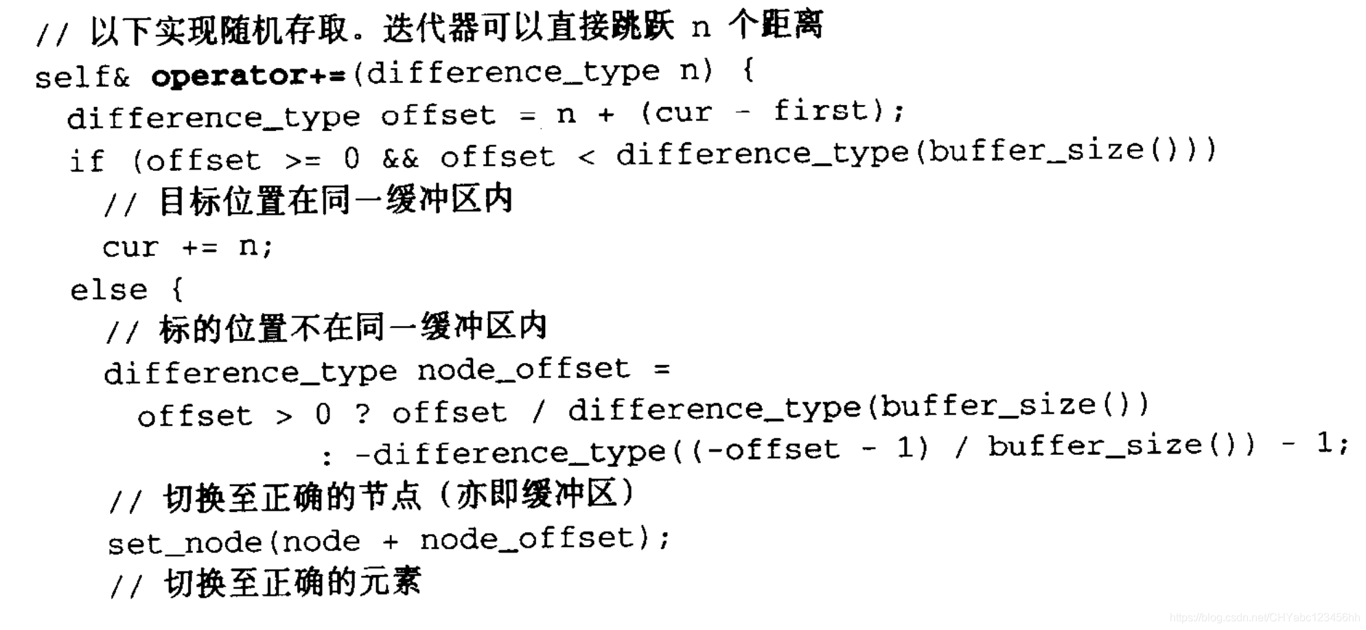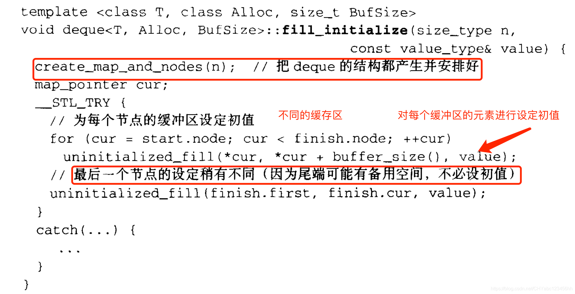 - deque是分段连续空间。维持其“整体连续”假象的任务,落在了迭代器的operator++ 和 operator--两个运算子身上。