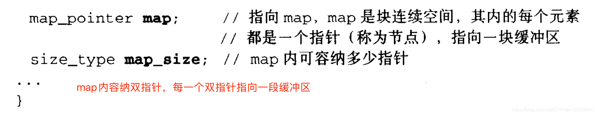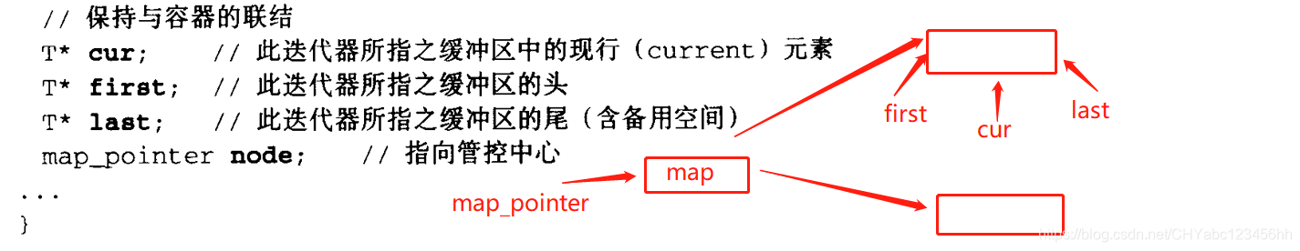 - map的结构如上图所示,呈现星型结构,map控制每一个分区;当迭代器在其中一个缓冲区的边缘的时候,面临向上或者向下跳转