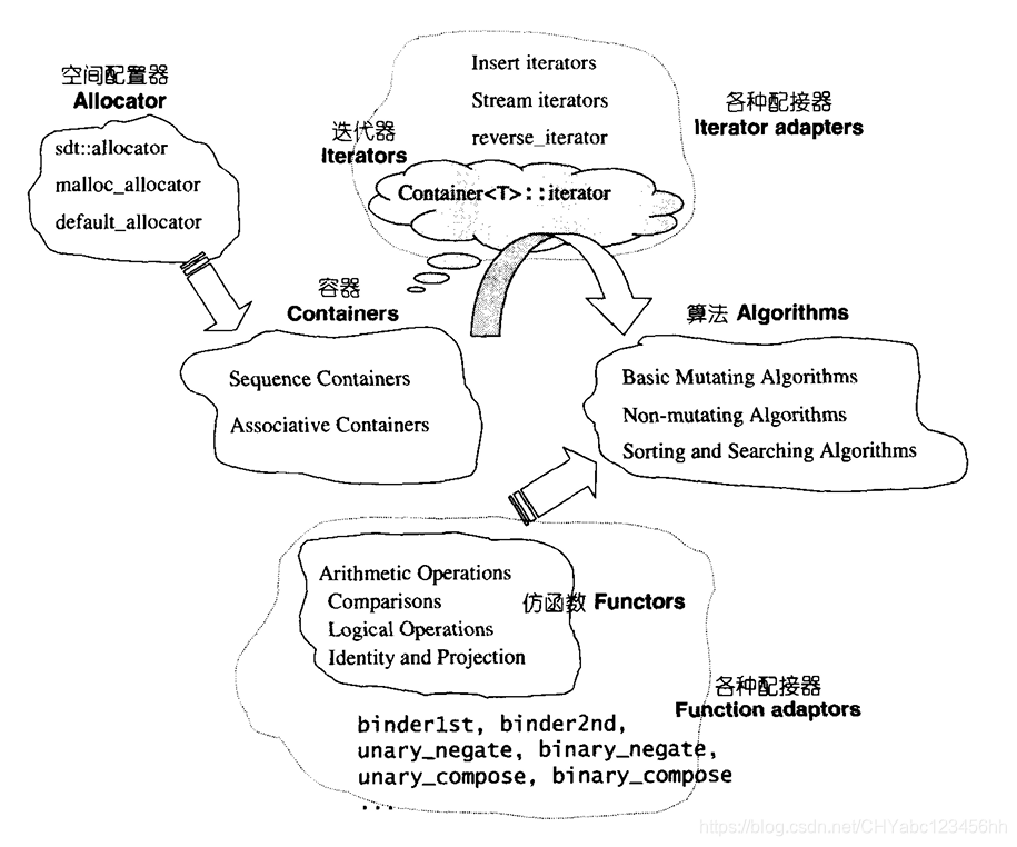 接口者,称 为 iterator adapter.配接器的实现技术很难一言以蔽之,必须逐 —分析,详见第8章 - 配置器(allocators): 负责空间配置与管理,详见第2 章。从实现的角度来 看,配置器是一个实现了动态空间配置、空间管理、空间释放的class template.