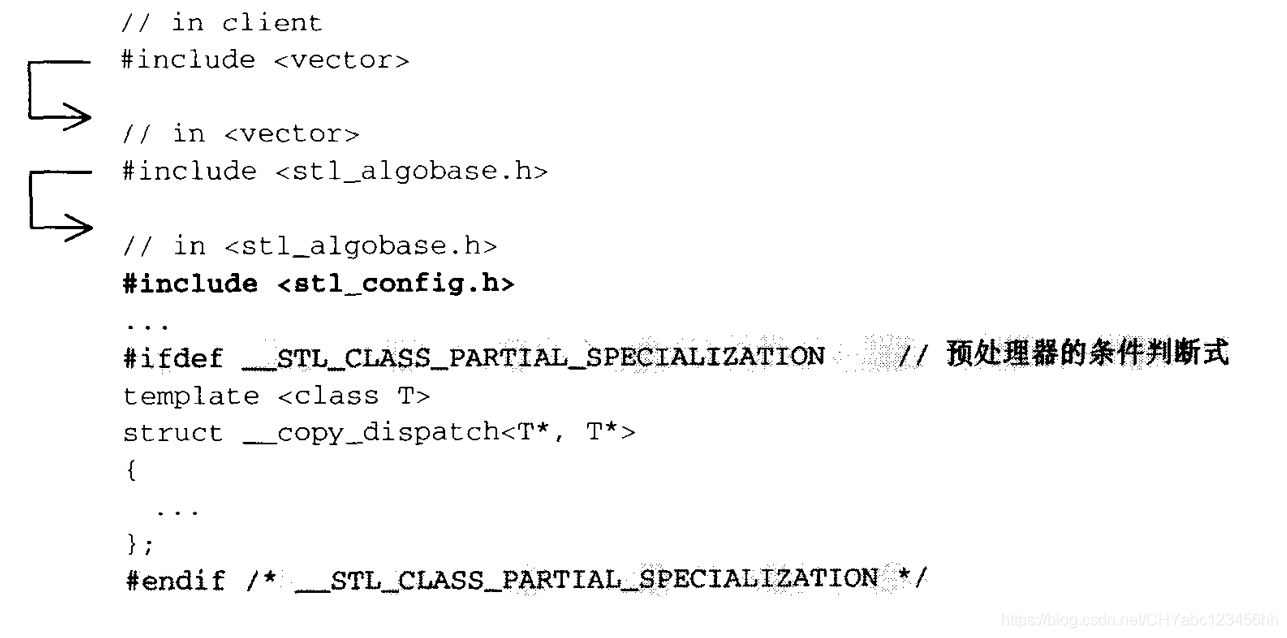 - 不同的编译器对C++语言的支持程度不尽相同。作为一个希望具备广泛移植能力的程序库,SGI S T L 准备了一个环境组态文件<stl_config.h>,其中定义了许多常量,标示某些组态的成立与否。所有STL头文件都会直接或间接包含这个组态文件,并以条件式写法,让预处理器(pre-processor)根据各个常量决定取舍哪 一段程序代码。例如:
