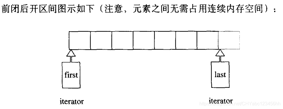 - 任何一个STL算法,都需要获得由一对迭代器(泛型指针)所标示的区间,用以表示操作范围。这一对迭代器所标示的是个所谓的前闭后开区间15,以 [first, last)表示。也就是说,整个实际范围从first开始,直到last-1.迭代器last 所指的是“最后一个元素的下一位置”。这种off by one (偏移一格,或说pass the end)的标示法,带来了许多方便,例如下面两个STL算法的循环设计,就显得干净利落: