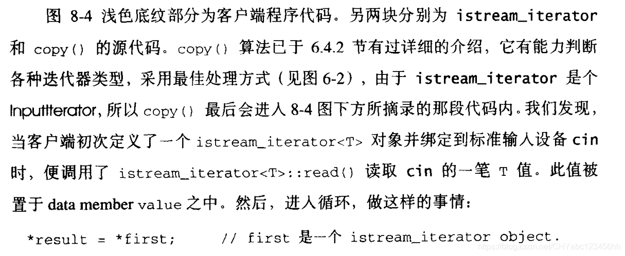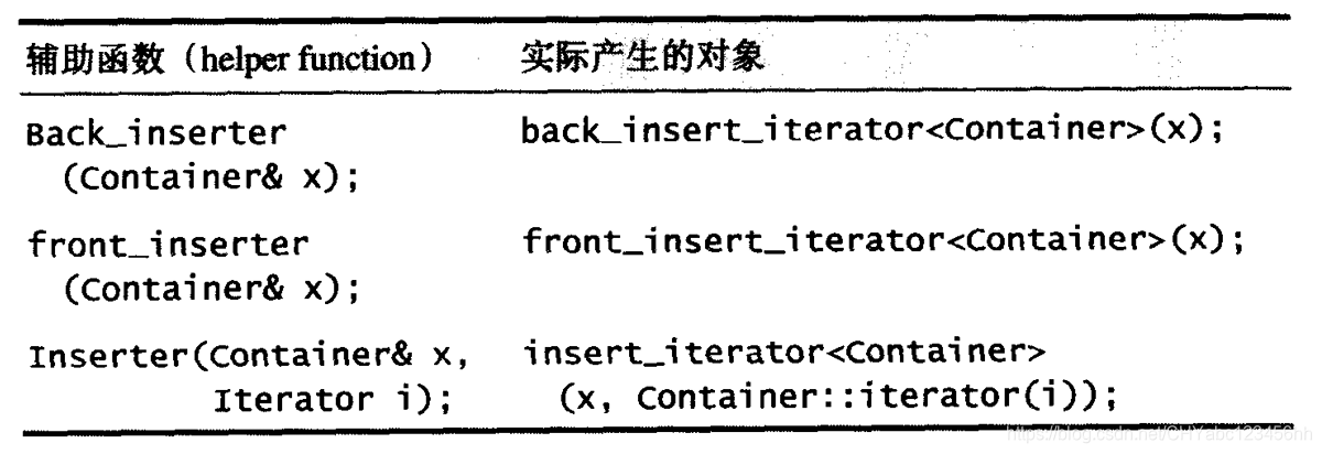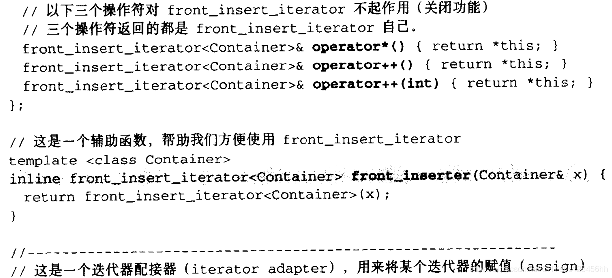 - 所 谓 insert iterators, 可以将一般迭代器的赋值(assign)操作转变为插入 (insert}-操作。这样的迭代器包括专司尾端插入操作的back_insert_-iterator, 专司头端插入操作的fro n t_ in se rt_ ite ra to r,以及可从任意位置执行插入操作的 insert_i te ra to ro 由于这三个iterator adapters的使用接口不是十分直观,给一般用户带来困扰,因此,STL更提供三个相应函数: back_inserter()、front_inserter()、 inserter(), 如图8-1所示,提升使用时的便利性。