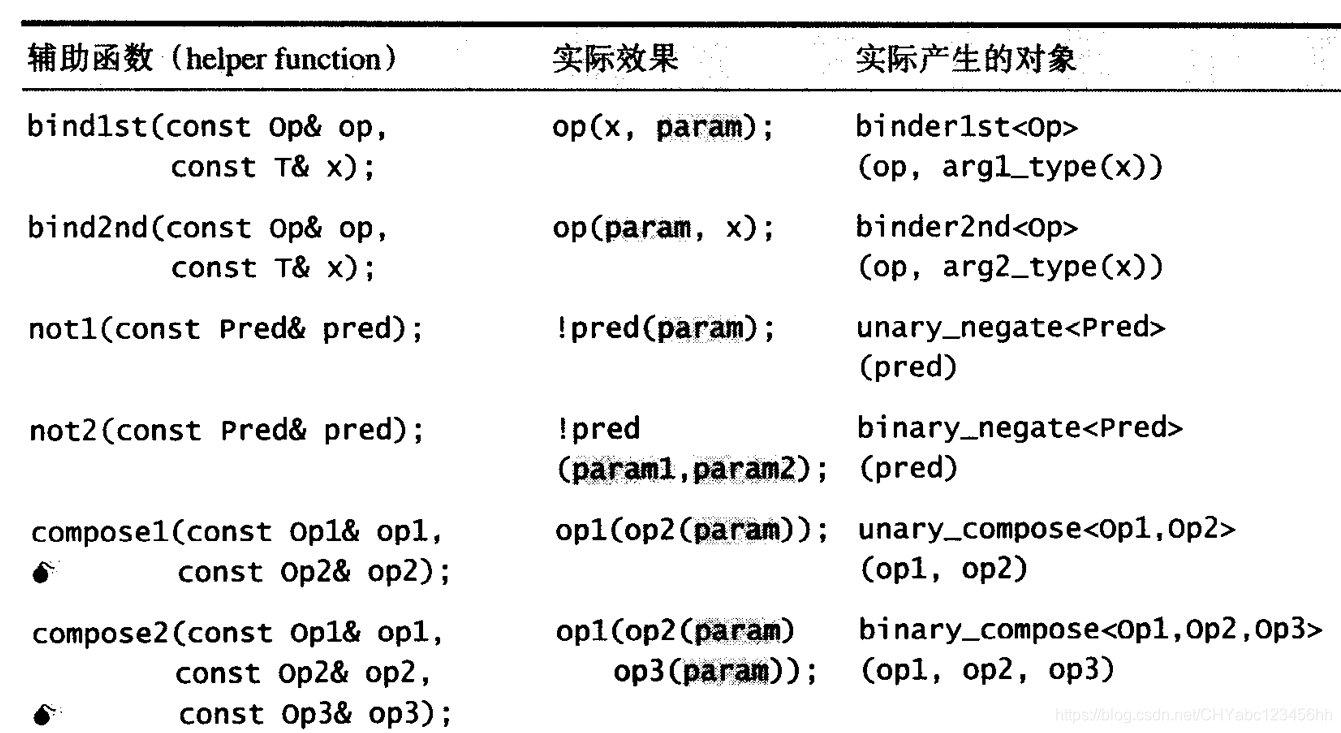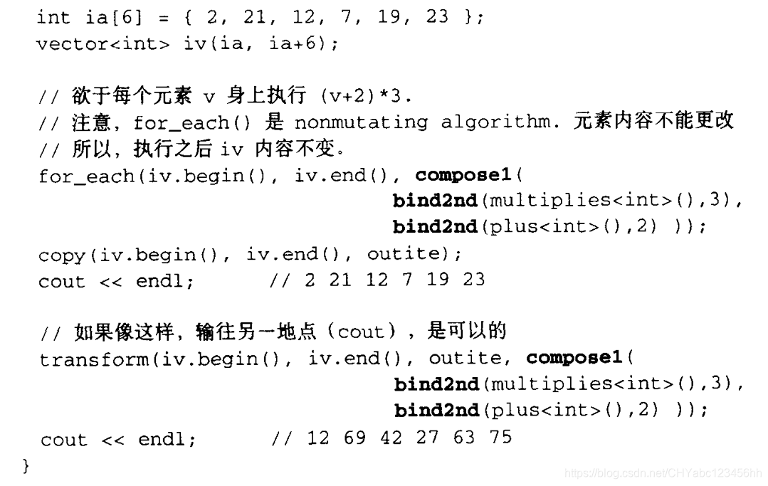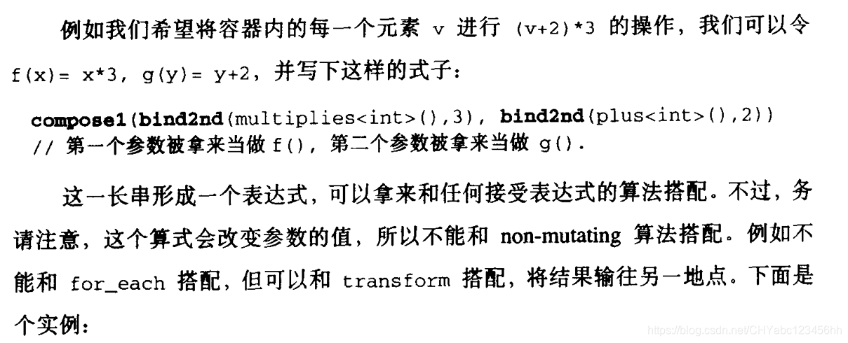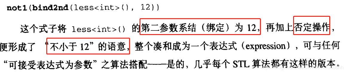 执行结果的否定、甚至多方函数的组合?请注意我用“事先” 一词。我的意思是,最后修饰结果(视为一个表达式,expression) 将被传给STL算法使用,STL算法 才是真正使用这表达式的主格。而我们都知道,只有在真正使用(调用)某个函数(或仿函数)时,才有可能对参数和执行结果做任何干涉。
